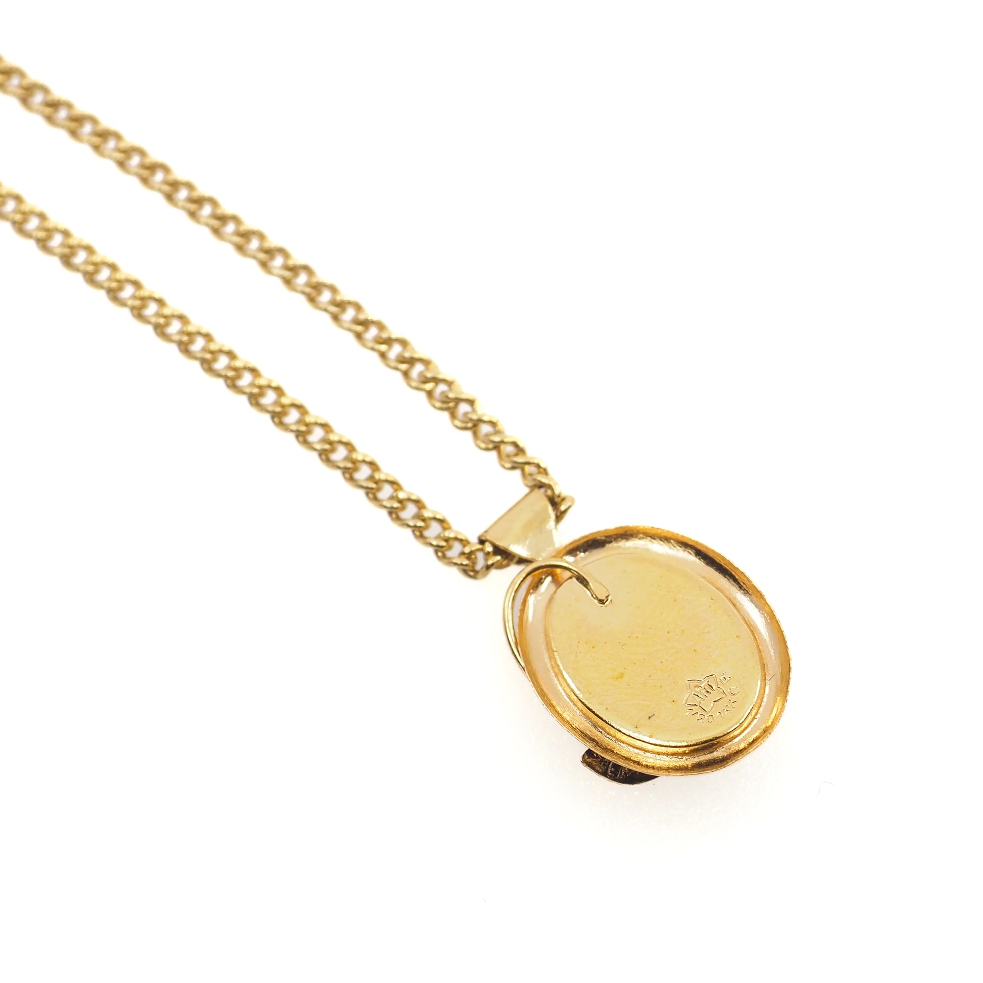 The necklace is in very good condition, with minimal signs of wear on the metal. There are a few light scratches, but nothing noticeable. The bail is stamped 1/20 14K GF and a maker's mark. The chain is not original to the piece.