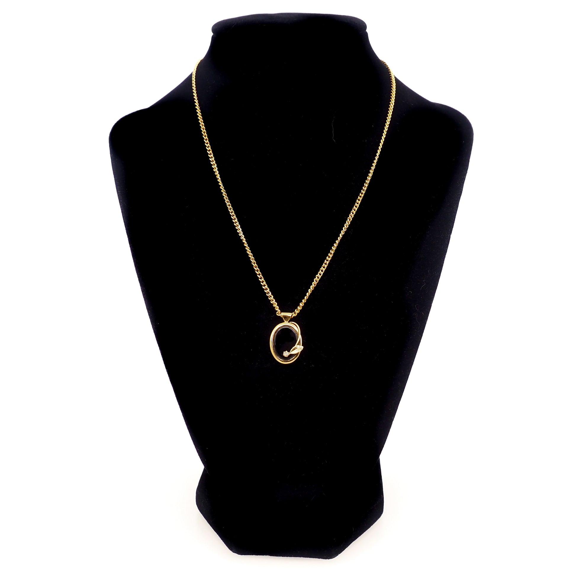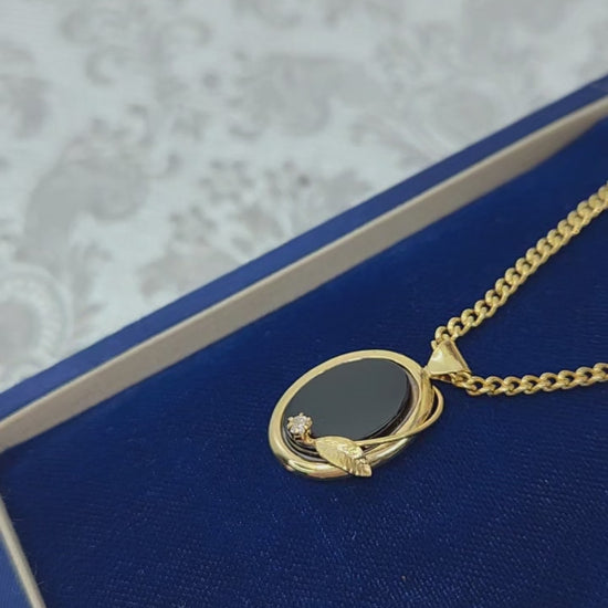 Draw everyone's eye with this gorgeous 1970s black onyx, lab moissanite, and yellow gold-filled necklace. The unique foliate design adds to the elegance, while the gem sparkles and glistens in the sunlight. A great vintage necklace to add to your collection!