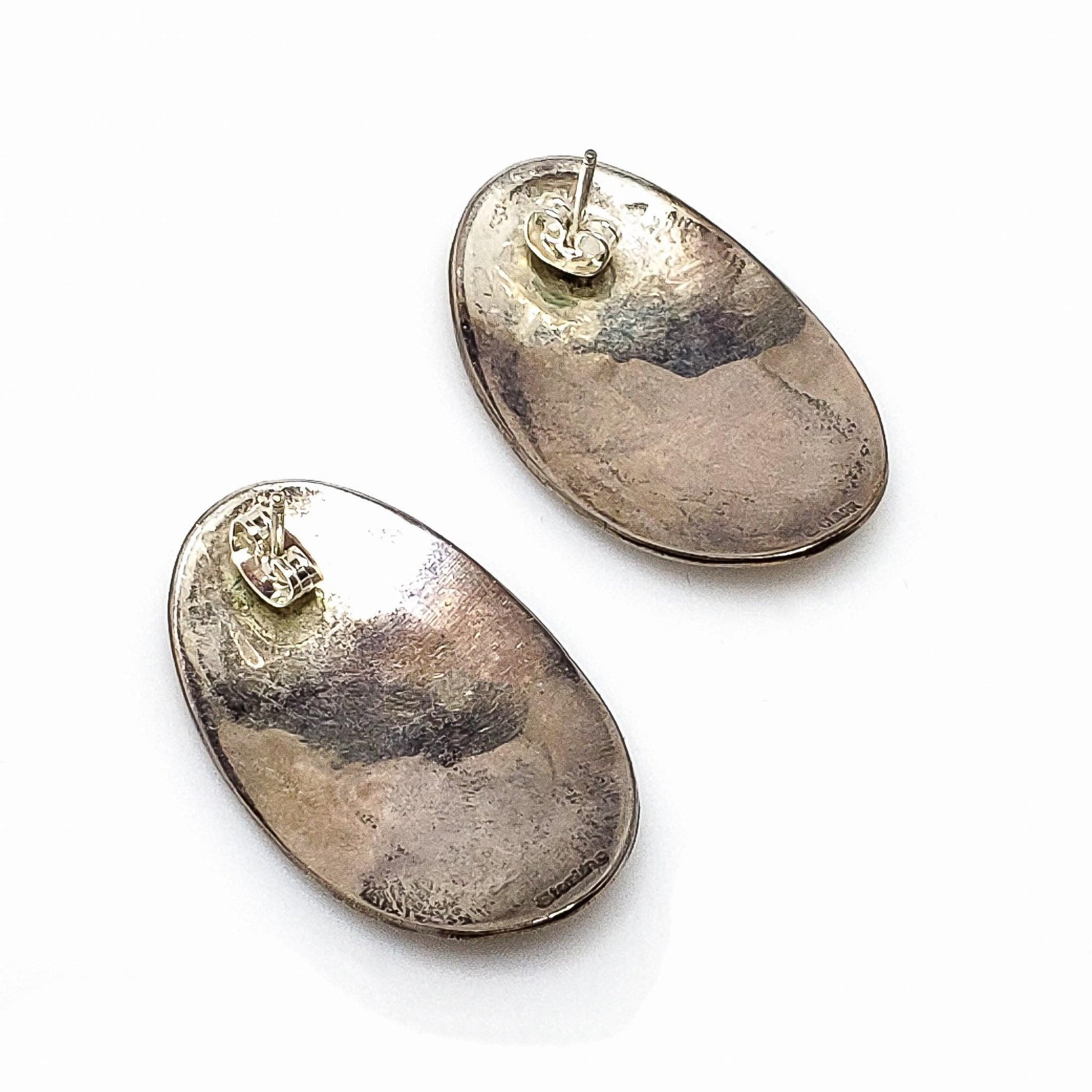 The earrings are in very good vintage condition with minimal signs of wear. The silver's surface has areas of a dark patina that can be polished upon request. The black patina in the recessed regions is part of the design, and there are light signs of wear on the silver surface. The earring backs are replacements, and the earrings are stamped E. CLARK STERLING.