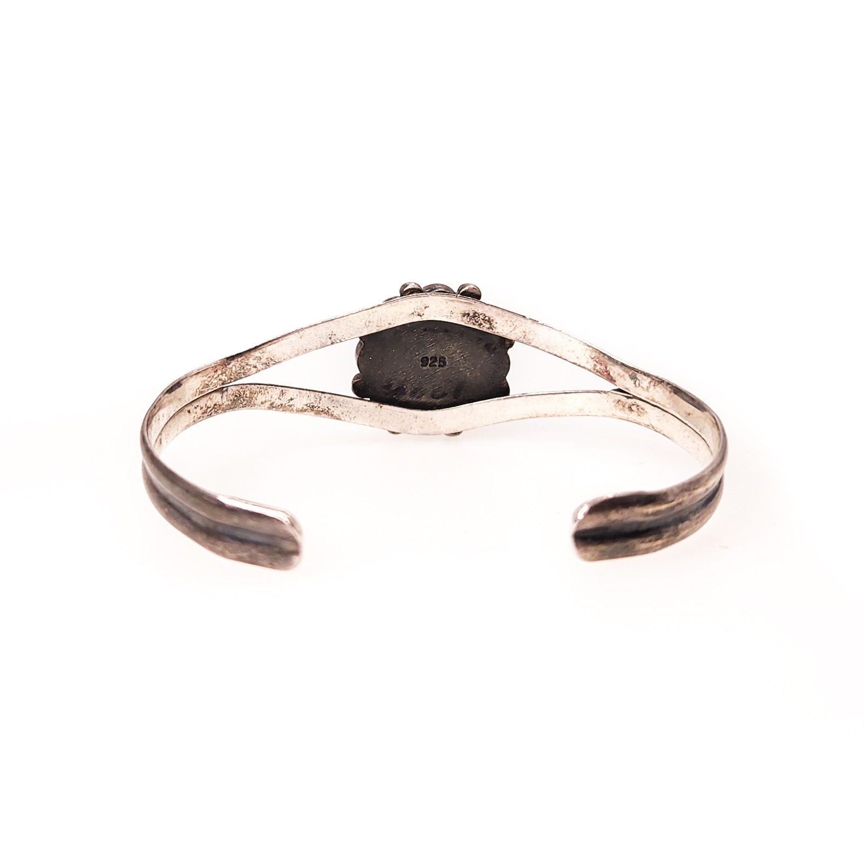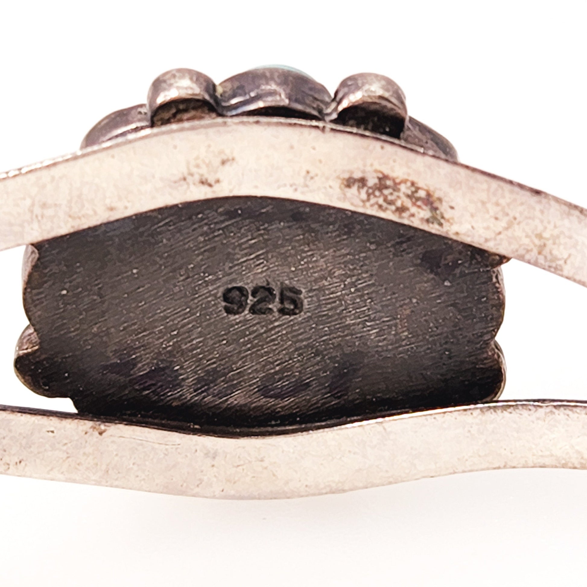 The cuff is in very good vintage condition with minimal signs of wear. The silver has fine lines and marks typical of vintage jewelry. The imitation turquoise is not chipped or cracked, and the back is stamped 925 for sterling silver.