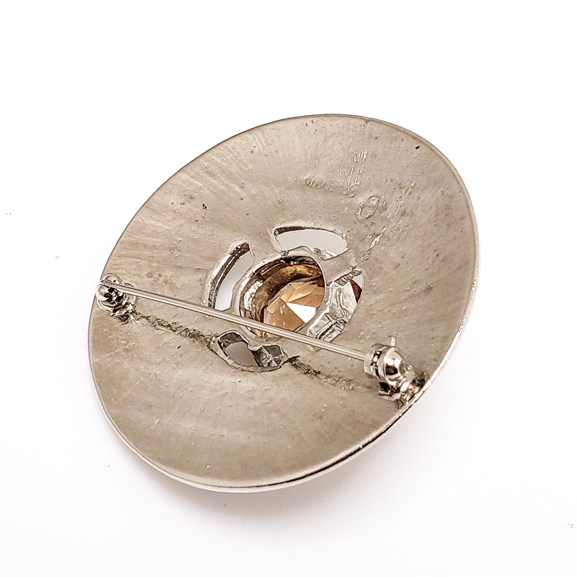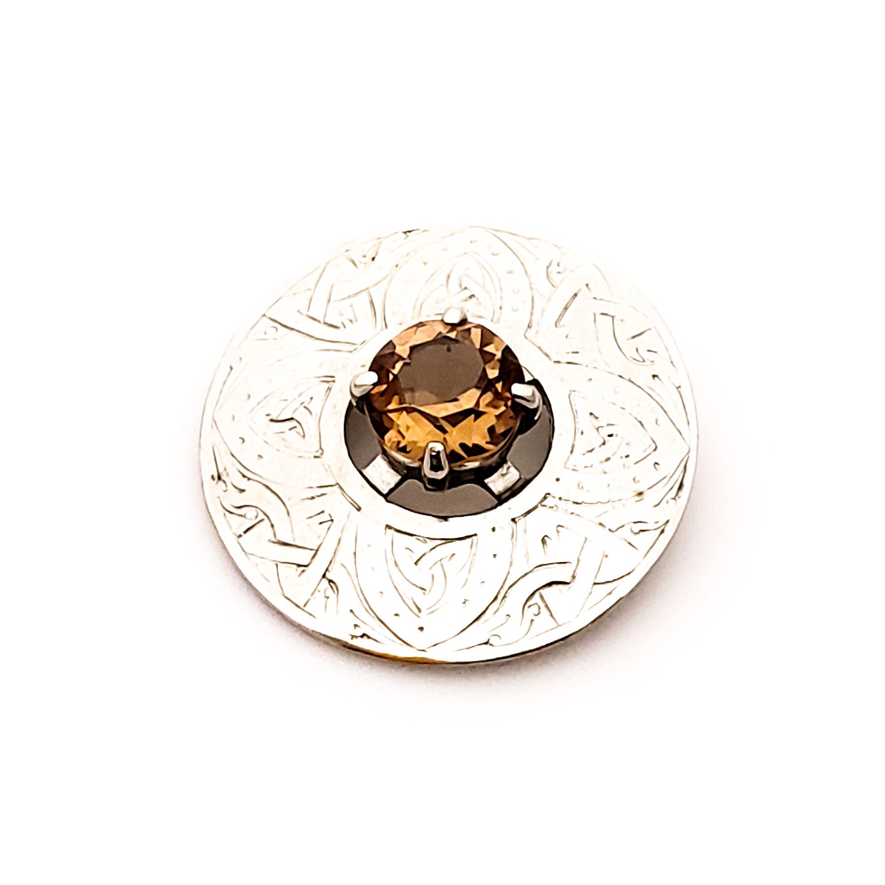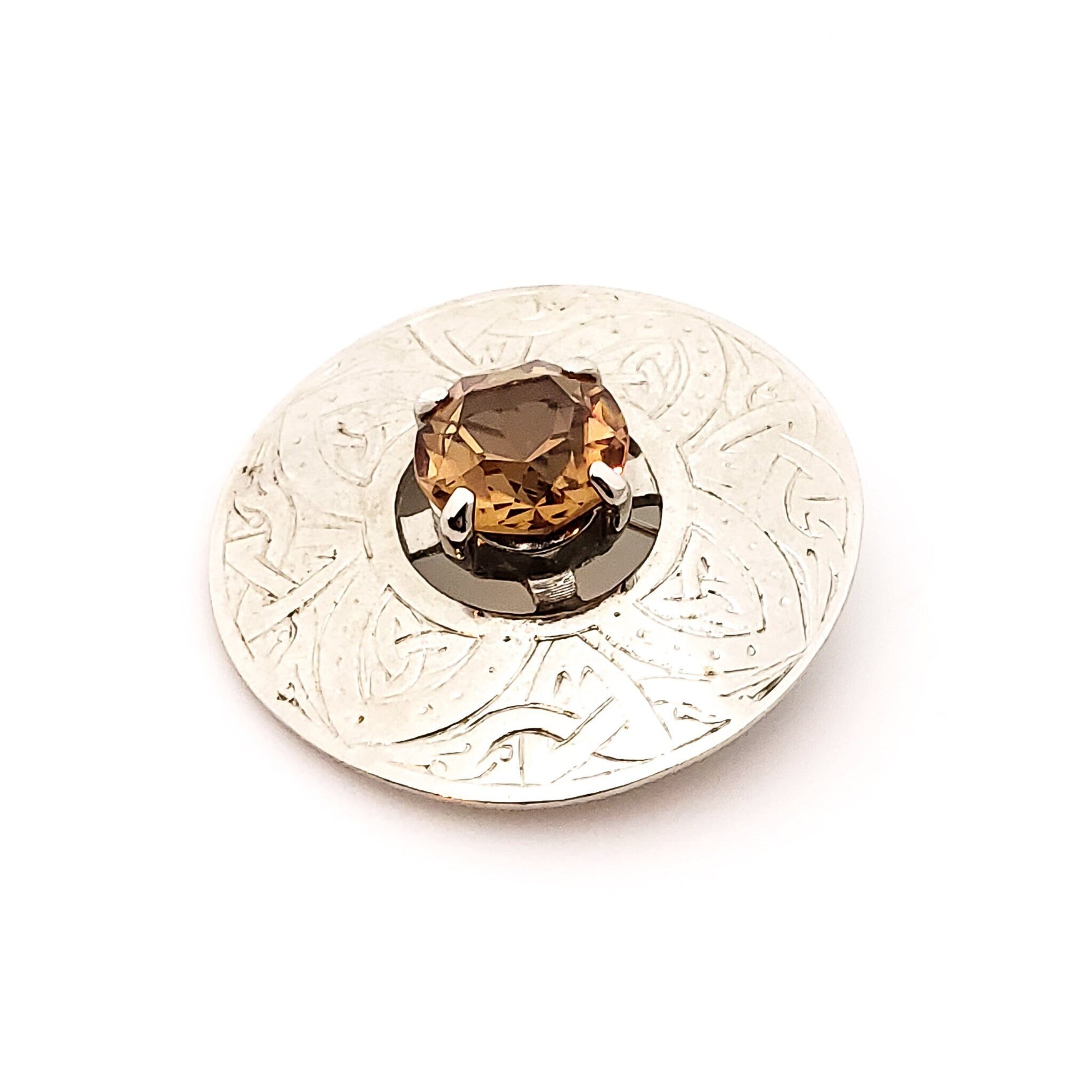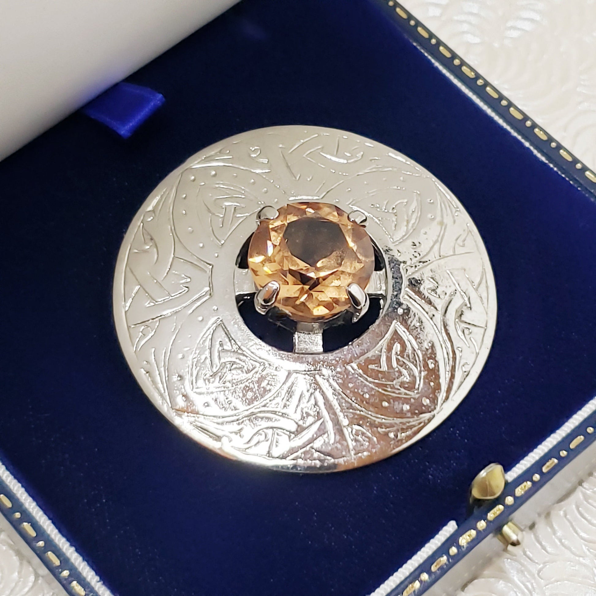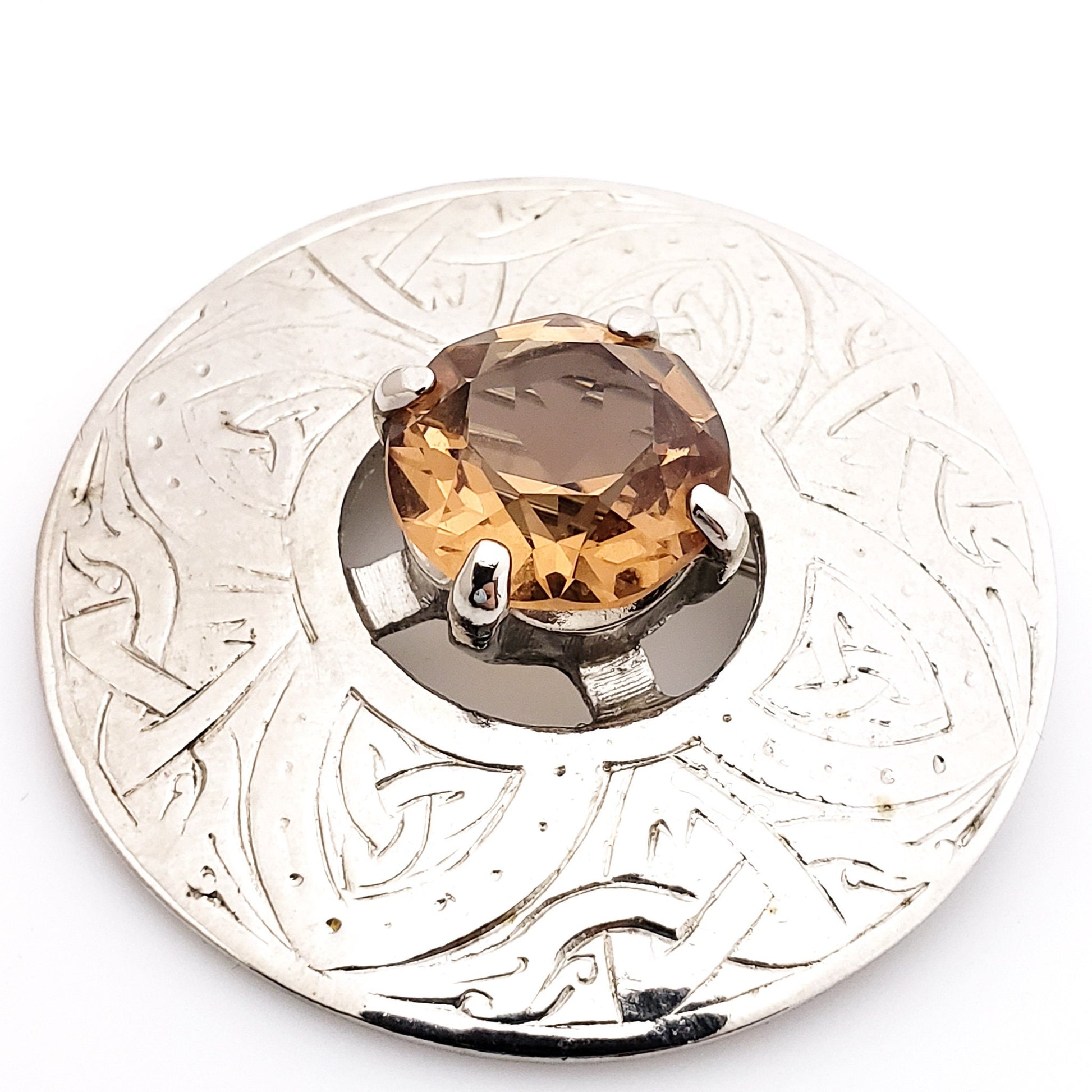 Crafted in Scotland, this gorgeous brooch is set with large, faceted orange glass in silver. The brooch has an intricate, Celtic motif adding to the piece‘s character. A great pin to add to your vintage collection!