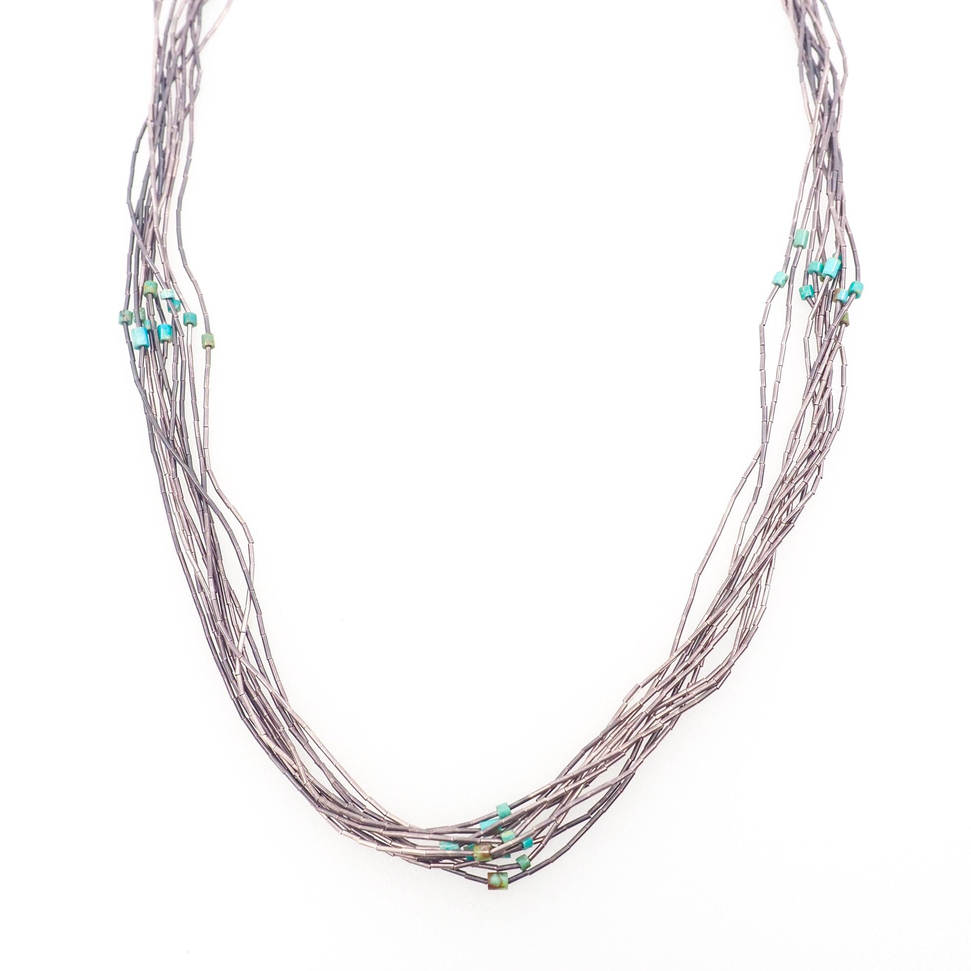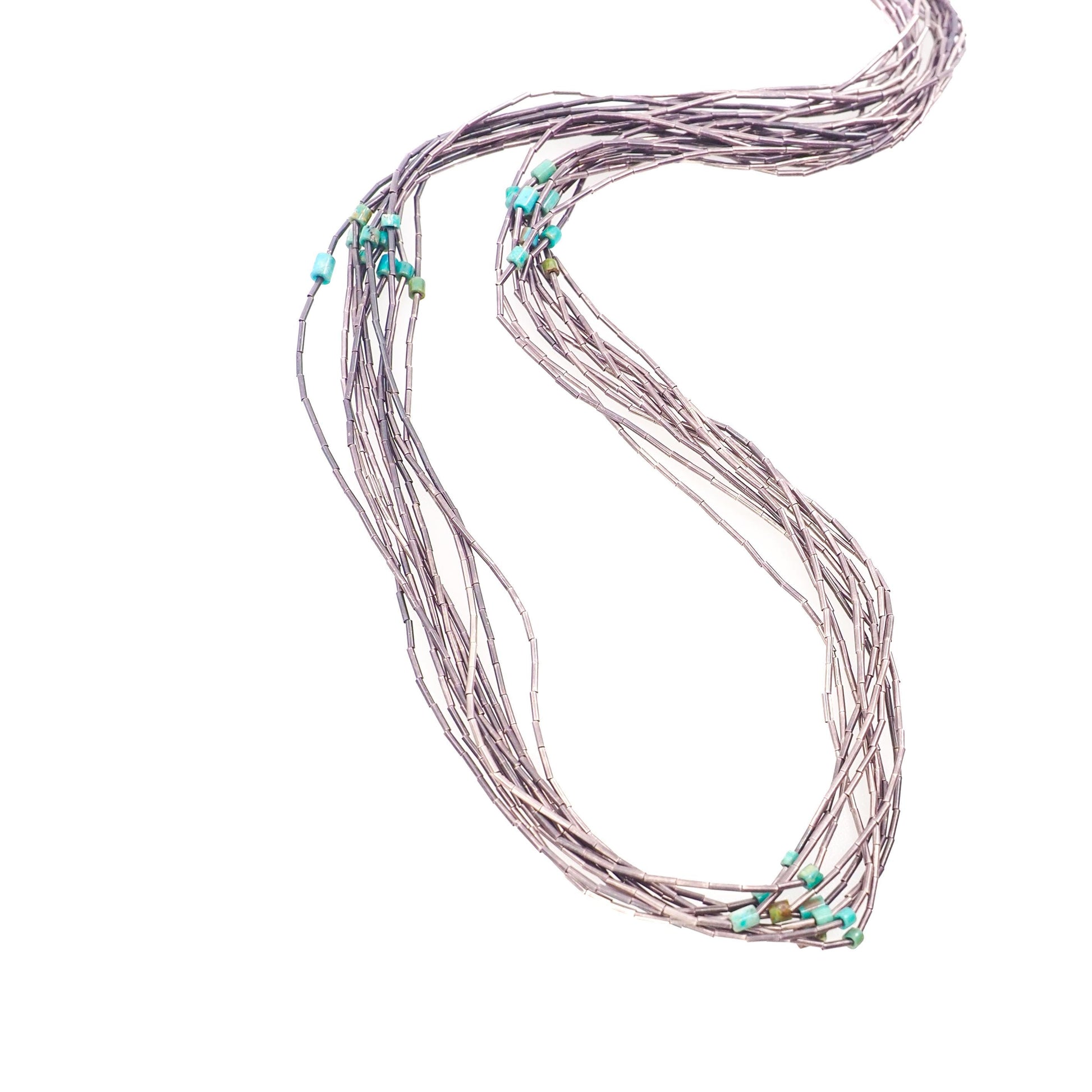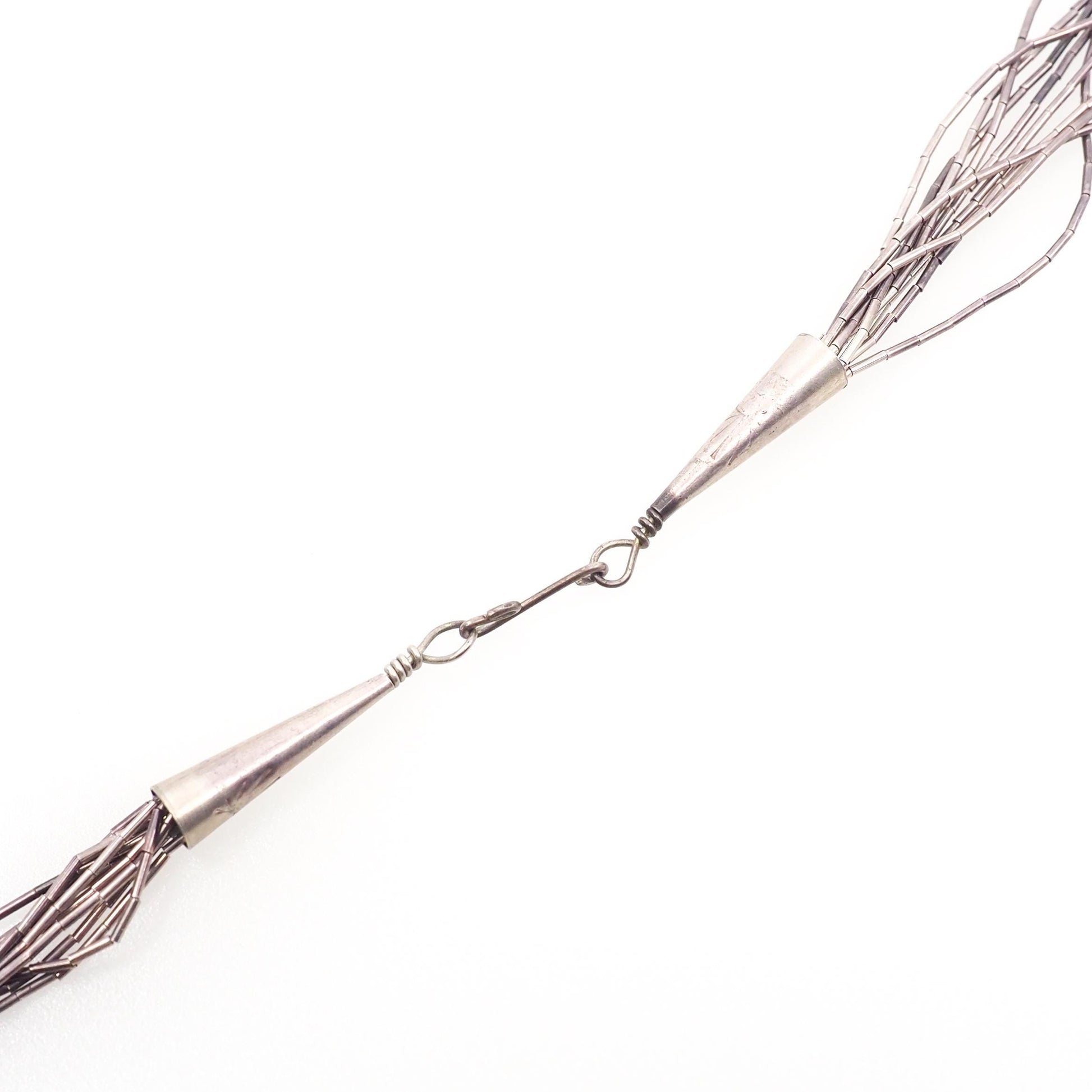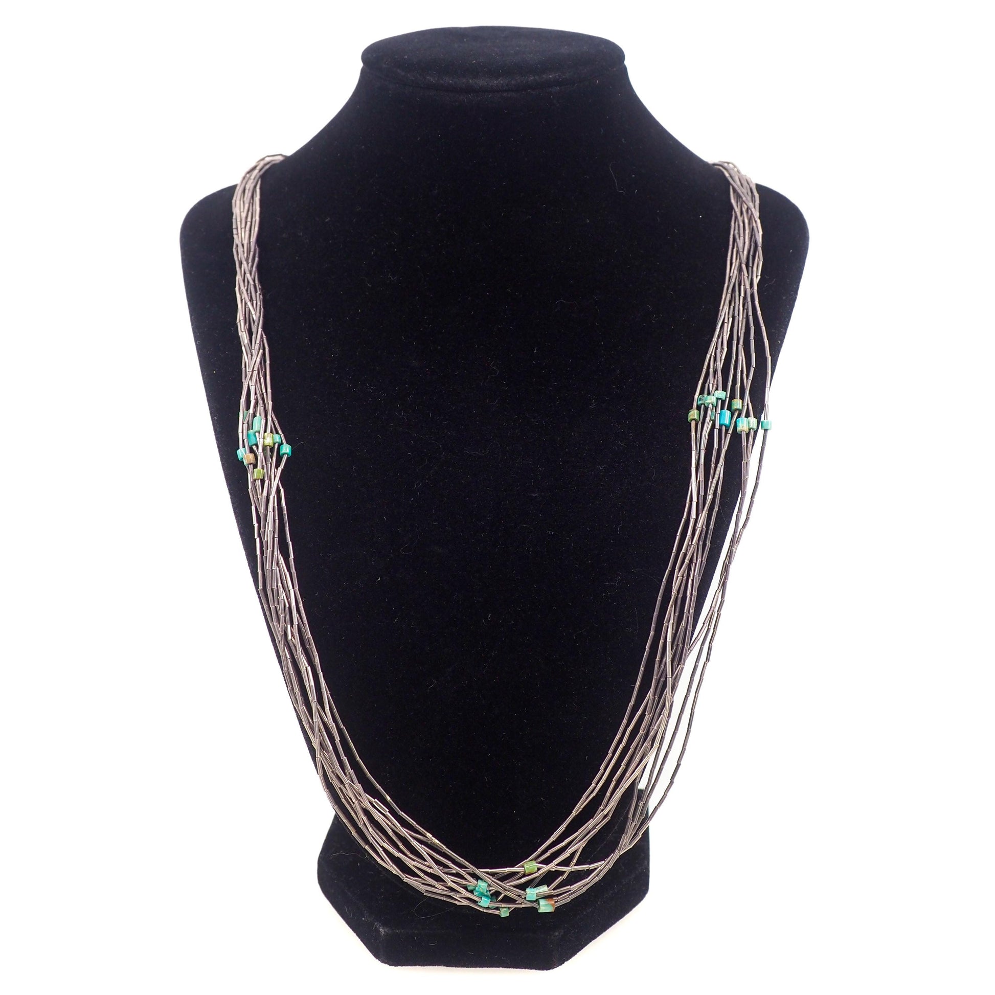 Crafted in the 1970s, this fun 10-strand liquid silver necklace features blue turquoise beads. Each delicate strand is hand-strung with tiny, long sterling silver and turquoise beads. The strands feel smooth together, and the necklace moves like liquid. This necklace style is popular with the Hopi, Zuni, and Navajo tribes of the American Southwest. It‘s a great statement piece to add to your jewelry collection!