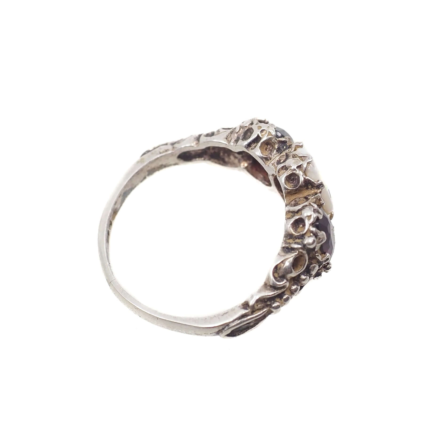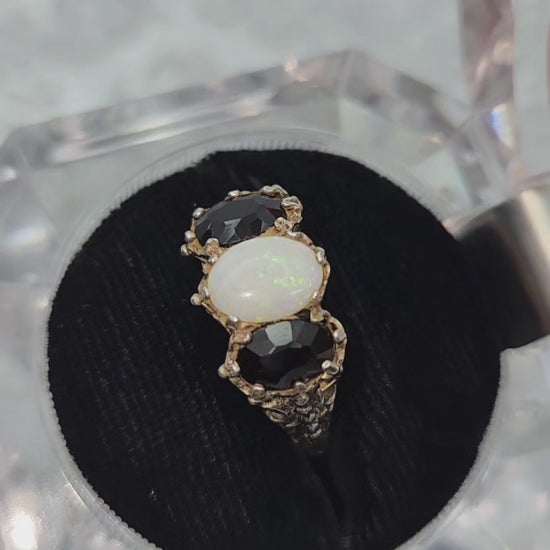 Made in London in 1979, this stunning ring features two orangish-red spessartine garnets and a white opal, set in sterling silver. Three-stone rings symbolize the past, present, and future of a relationship.