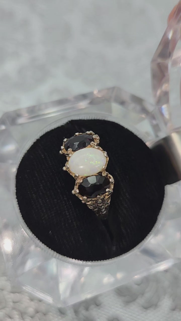 Vintage 1970s Opal, Spessartine Garnet, and Sterling Silver Three Stone Ring Size 7.25