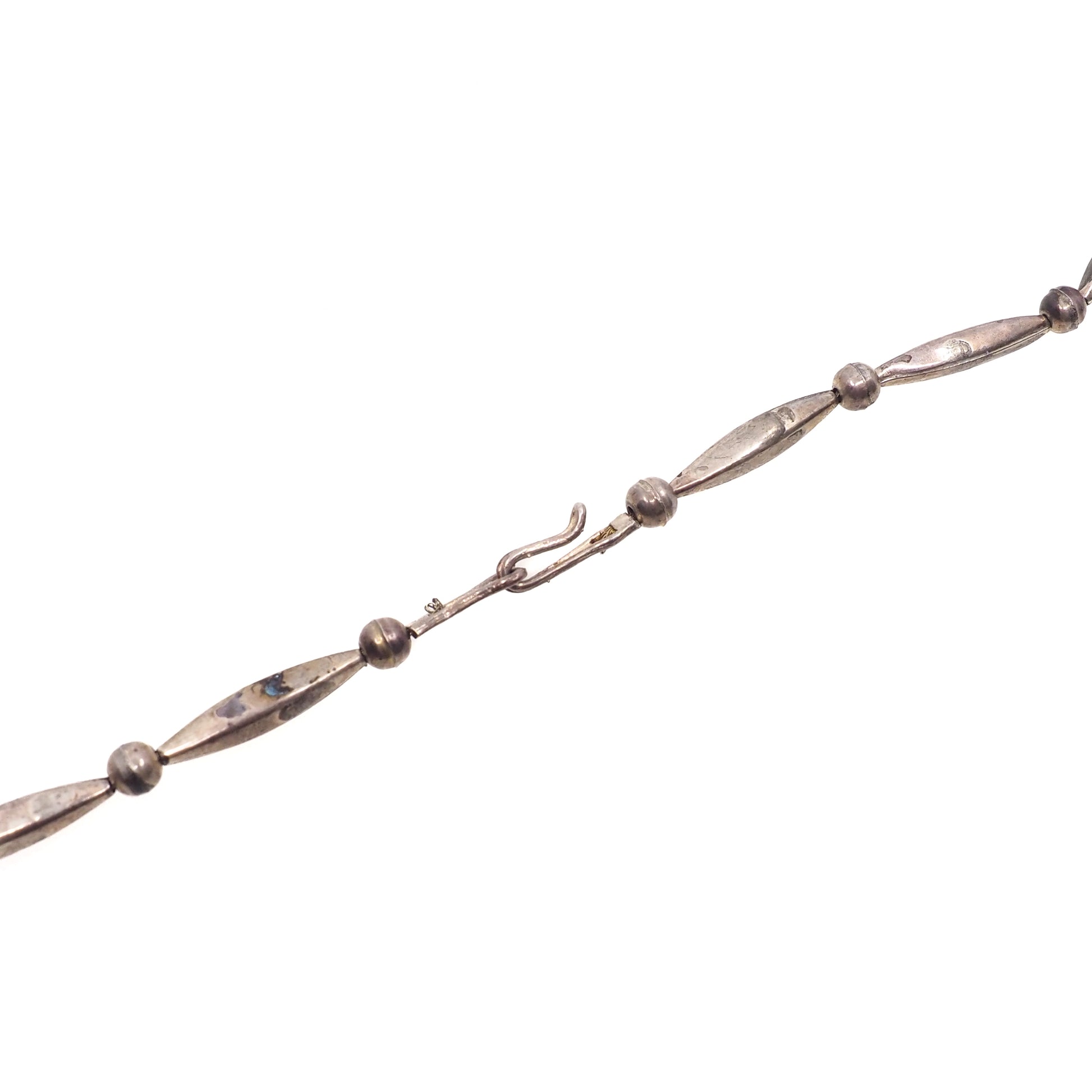 The necklace is in very good vintage condition with minimal signs of wear. The silver shows signs of patina, which can be polished upon request. The fishhook clasp is fully functional, with no stamps or marks. There are a few dark patina spots near the clasp.