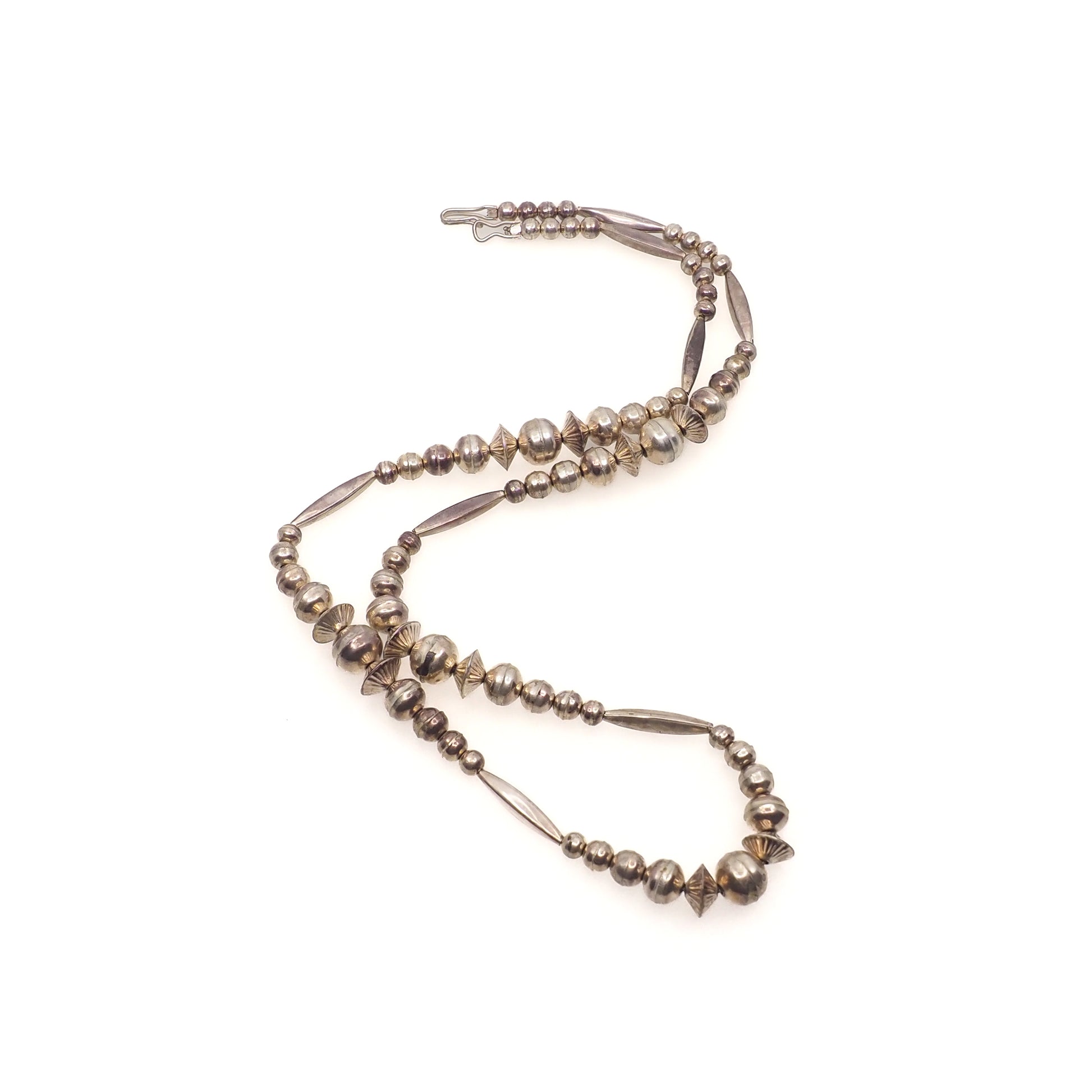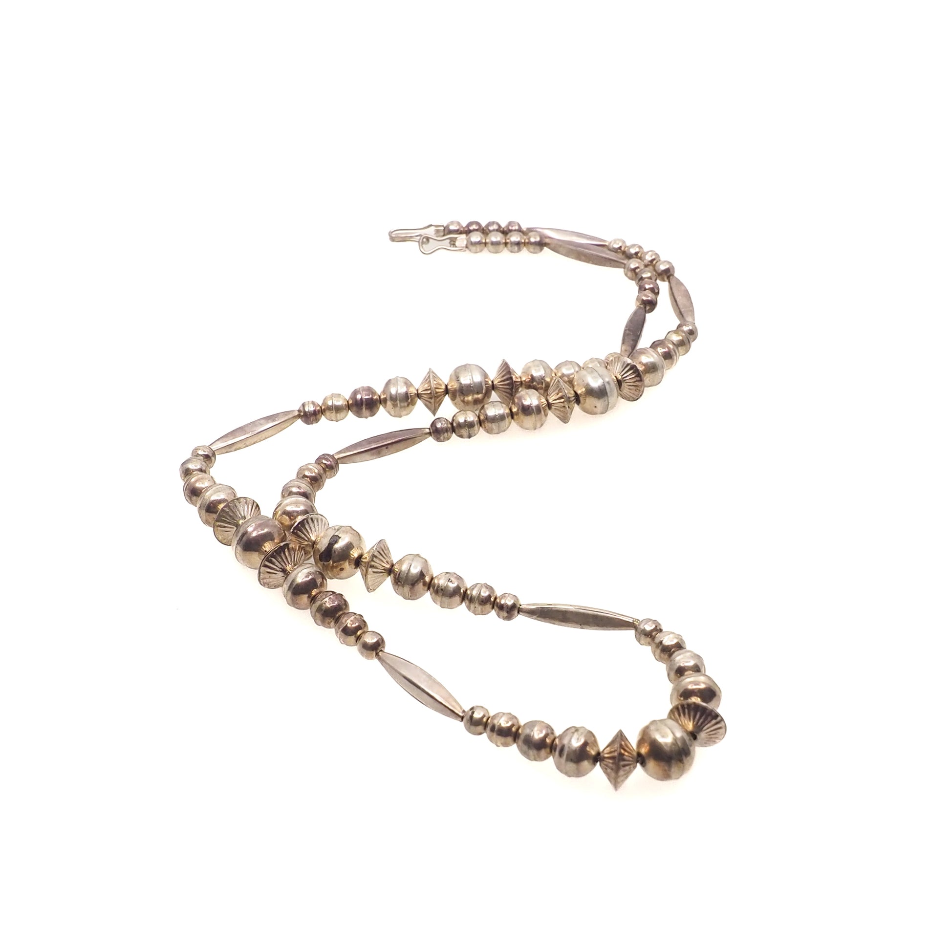 Crafted in the 1970s, this Navajo sterling silver beaded necklace is a lovely vintage piece. This fun necklace is strung with handmade round, disk, torpedo, or melon beads. A fabulous necklace to wear alone or layered!