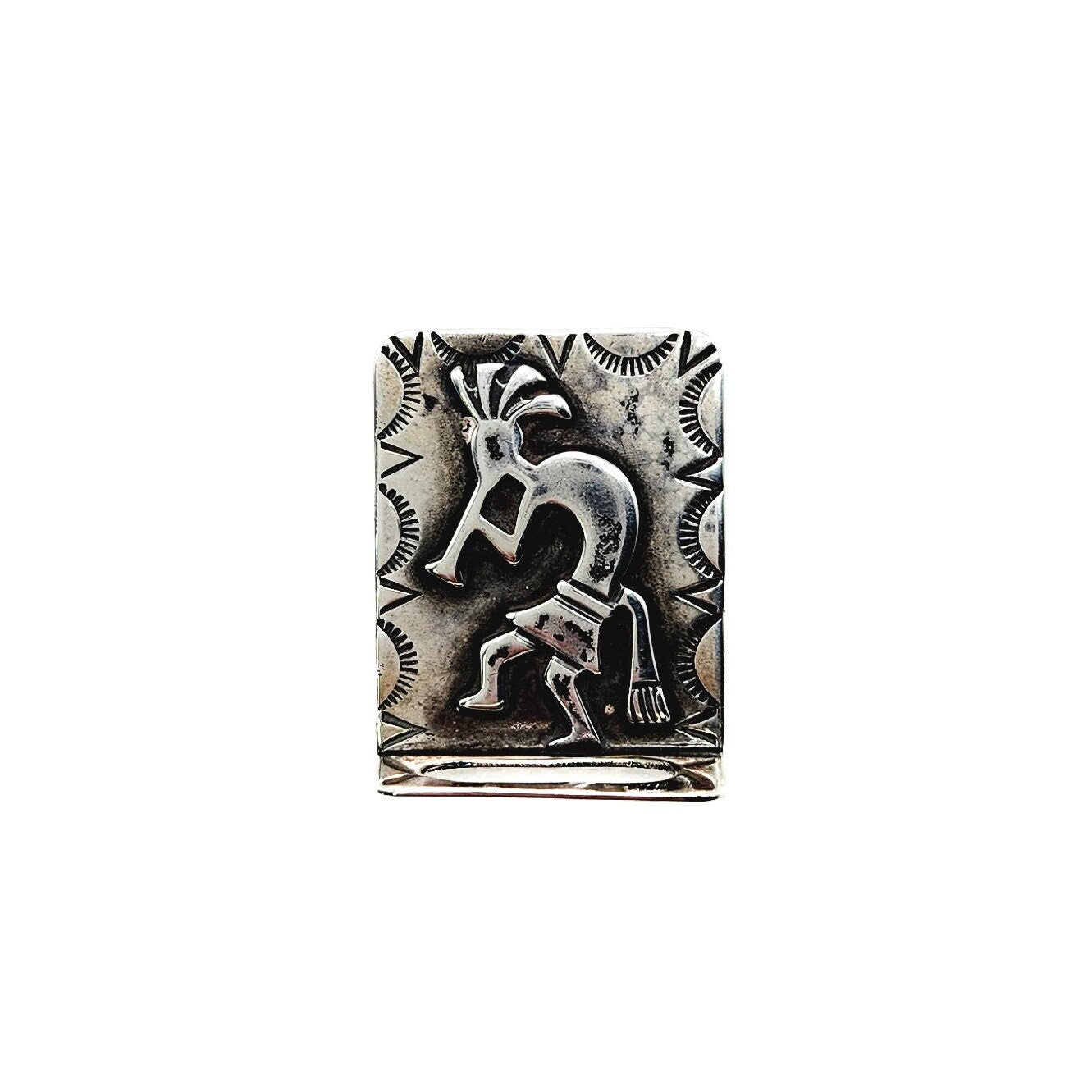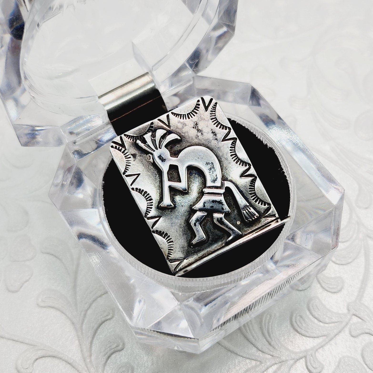 Step into the world of timeless beauty with our vintage 1970s sterling Zuni Kokopelli posey pin. Crafted with love and meticulous artistry, this exquisite piece showcases the iconic Kokopelli symbol in stunning sterling silver. Perfect for men and women who adore jewelry, this brooch is a charming accessory that will effortlessly enhance your style with its unique allure. Let this brooch be a cherished addition to your collection, radiating a sense of cultural appreciation and individuality with every wear.