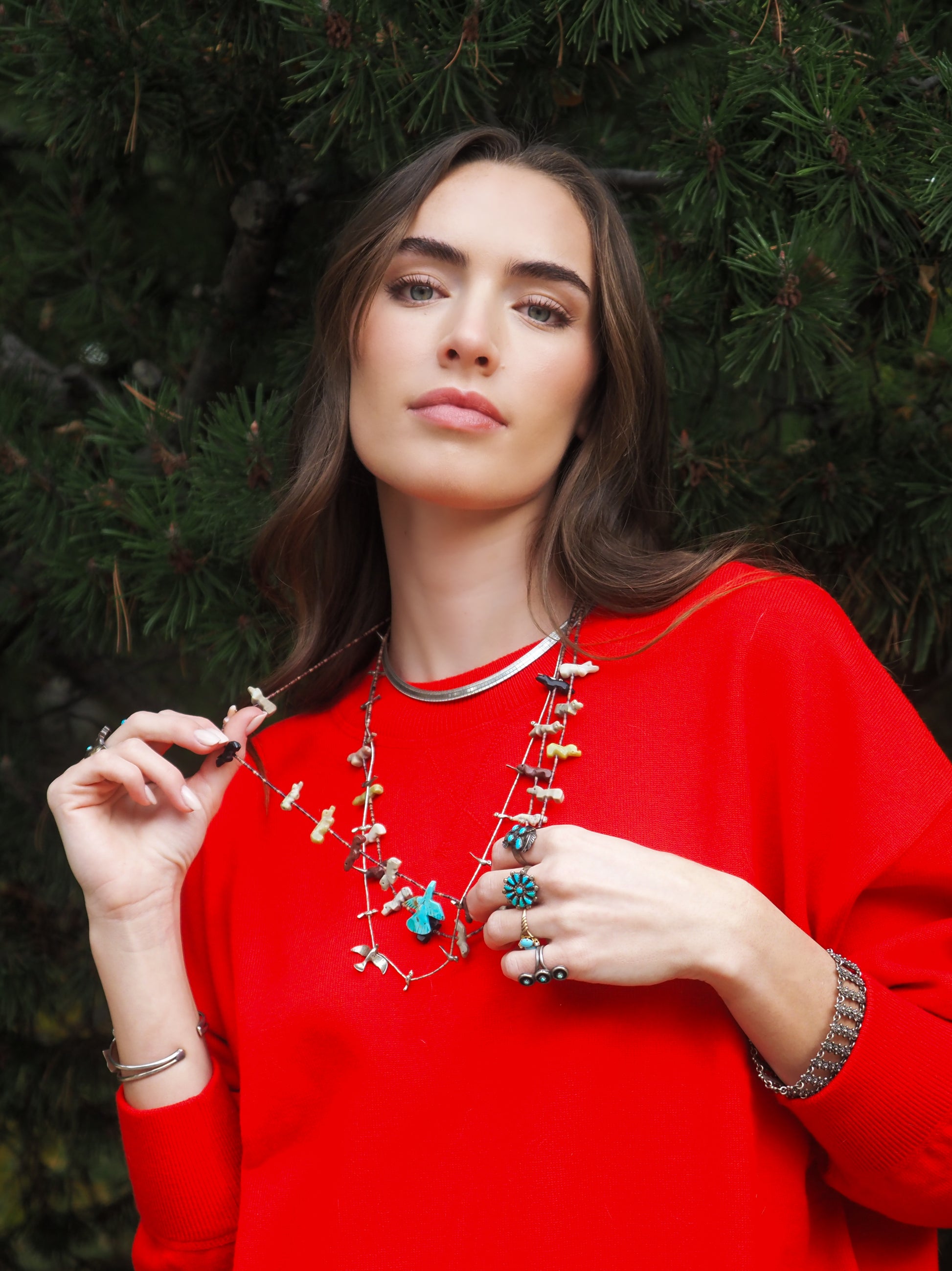 This fun bird fetish necklace was crafted by the Zuni tribe in the 1970s. The tiny, detailed birds rest between disc-shaped, heishi silver beads, usually made by the Santo Domingo tribe. The small birds are slightly curved and even feature tiny eyes. This is an excellent single-strand necklace to wear alone or layered.