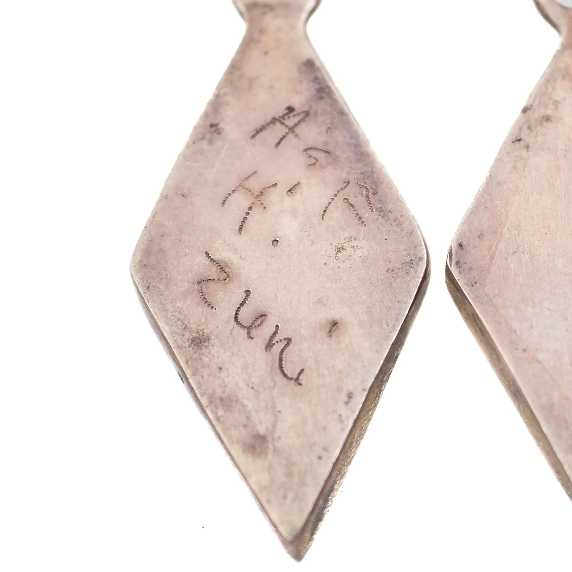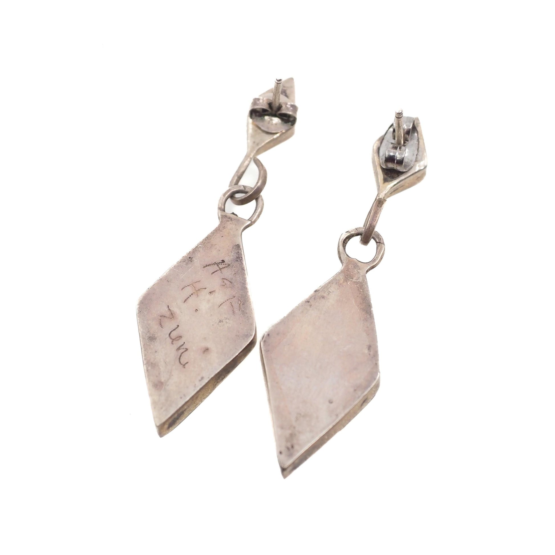 The earrings are in very good vintage condition with minimal signs of wear. Under magnification, the stones and silver surface show slight signs of wear, but no stones are chipped or cracked. The silver has a moderate layer of patina that can be polished upon request. One earring back is marked A & F H‘ ZUNI.
