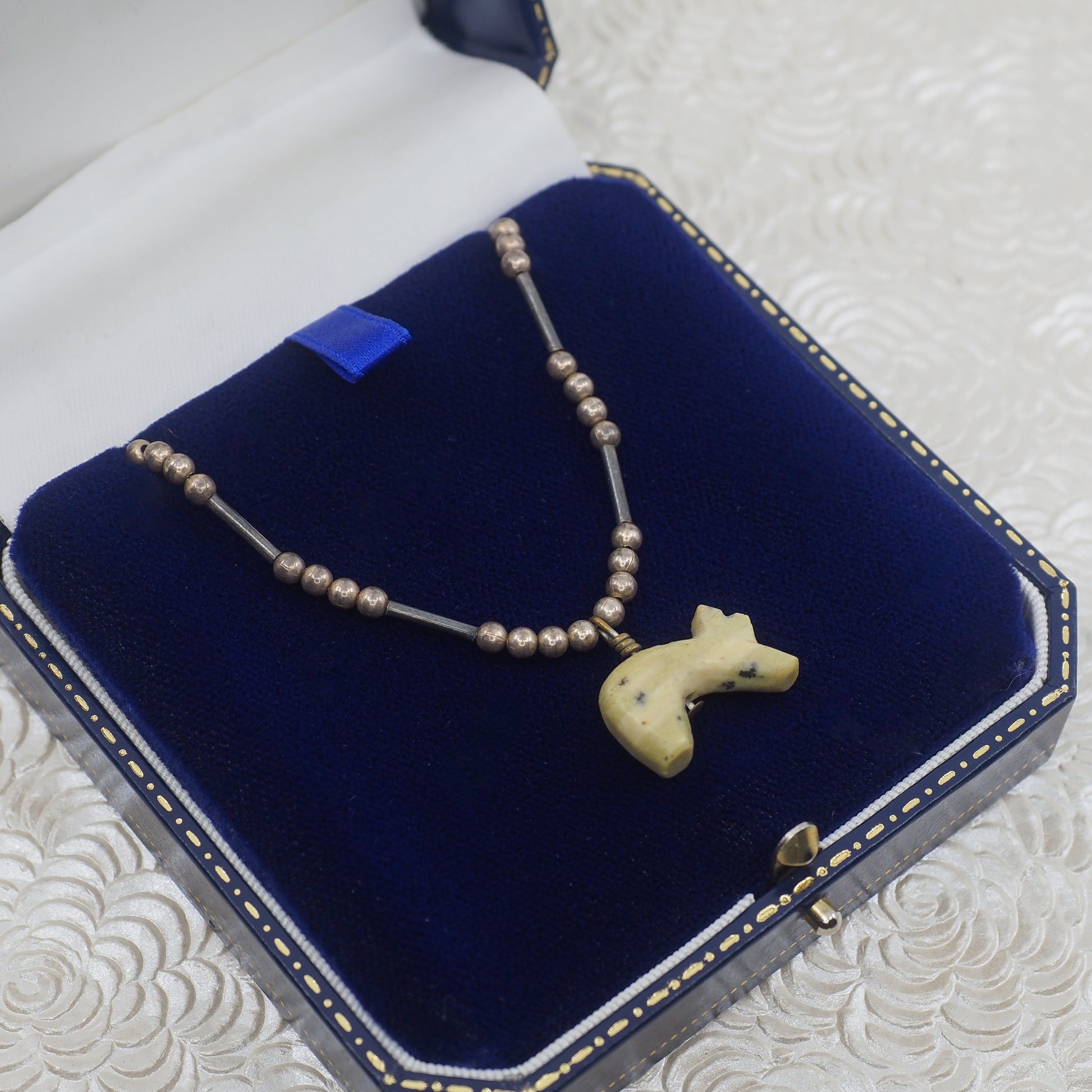 This adorable serpentine bear fetish choker necklace was crafted by the Zuni tribe in the 1970s. The small bear fetish decorates the sterling silver beads. It’s a great single-strand necklace to wear alone or layered.