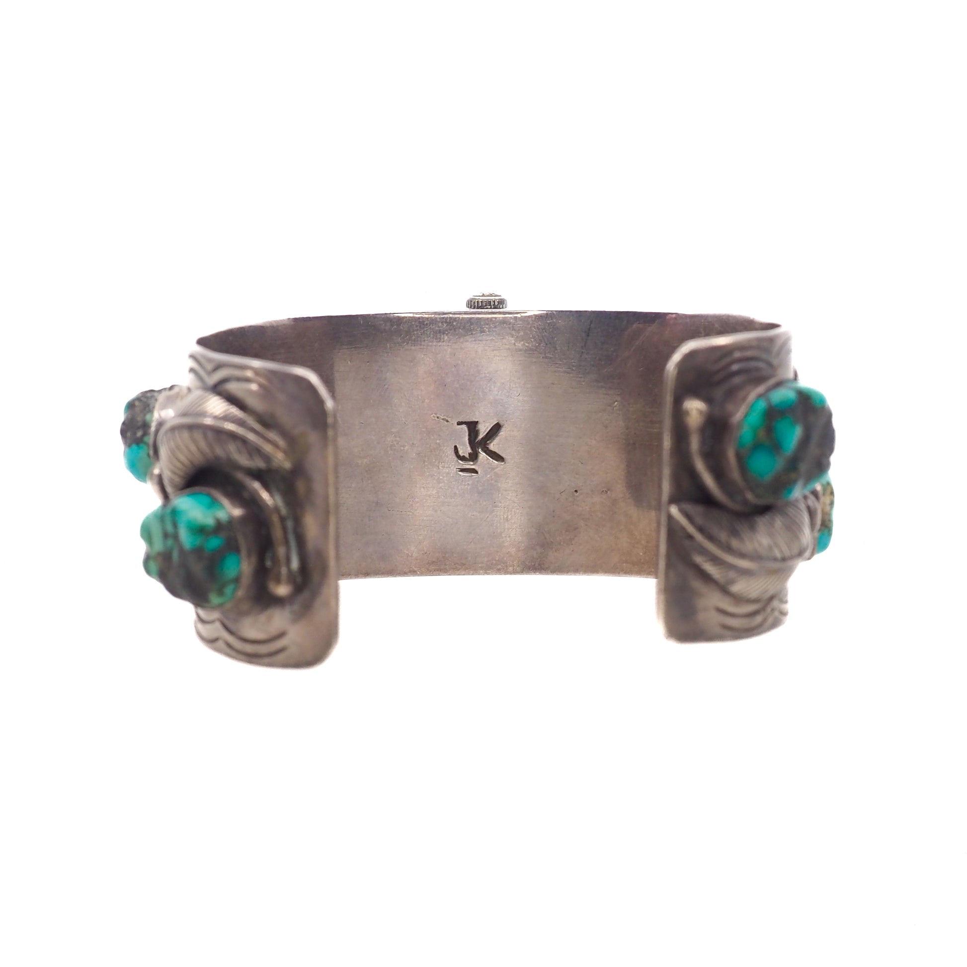 Crafted in the 1980s, this unique watch made from Zuni silversmith Effie Calavaza features bright blue nuggets of turquoise set into sterling silver. Each gemstone is surrounded by a silver snake inlaid with turquoise eyes, which gives the piece an excellent southwestern feel. This watch's unique feature is that it keeps track of the calendar in English and Spanish (Monday = Mon and Lun). An excellent piece for snake-lovers and December babies!