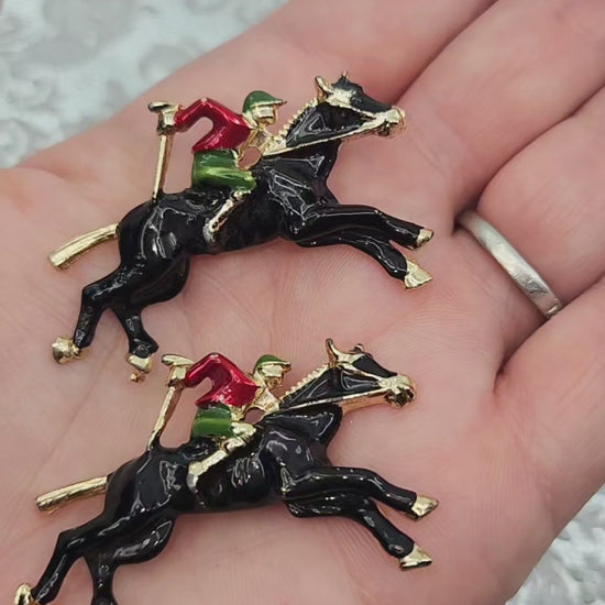 These charming vintage 1980s colorful enamel jockey and horse brooches are very endearing. The enamel chips off the gold-toned metal. A fabulous matching pair of figural brooches for the jockey or horse enthusiast in your life!