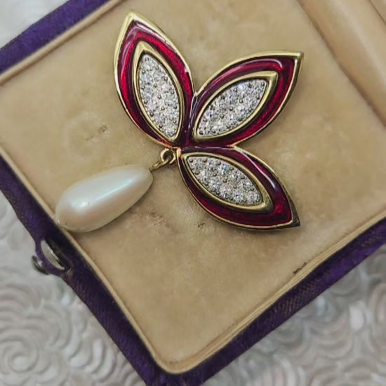 Vintage 1980s MONET Red Enamel, Imitation Pearl, and Rhinestone Brooch