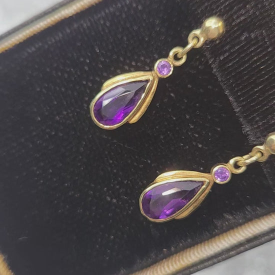 The earrings are in excellent vintage condition, with minimal signs of wear. The backs are stamped '585' for 14K gold. The amethyst is natural and not chipped or cracked.