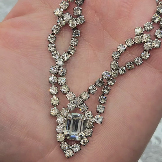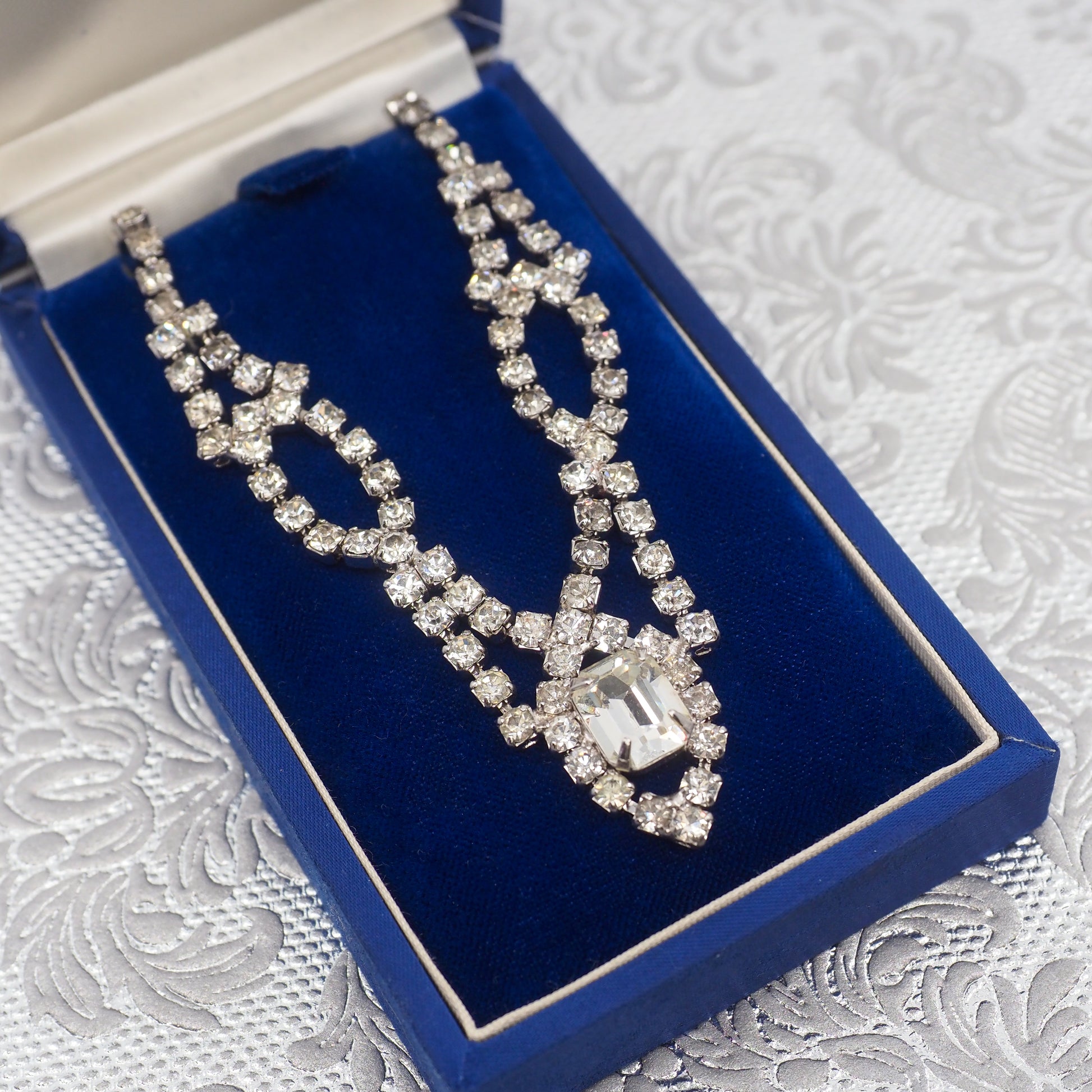 The necklace is in very good vintage condition with minimal signs of wear. The rhinestones are all firmly prong-set into the metal, and only a few show the tiniest signs of yellowing, none of which are noticeable or distracting. The hook clasp is fully functional, and there are no marks or stamps on the piece.