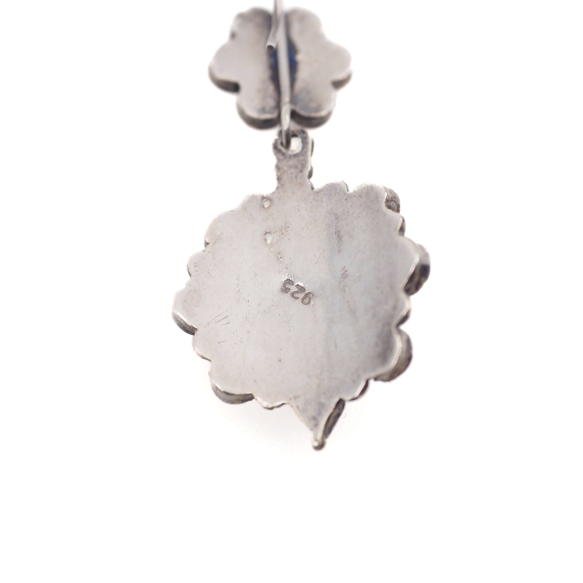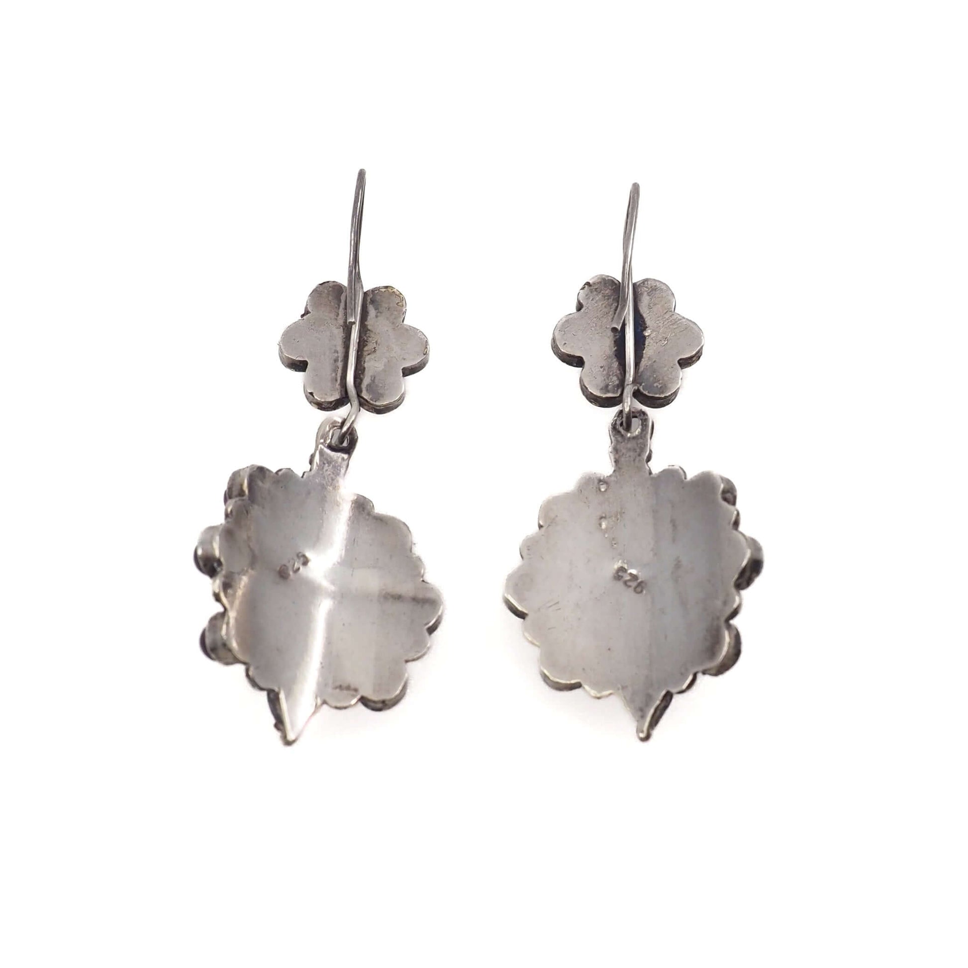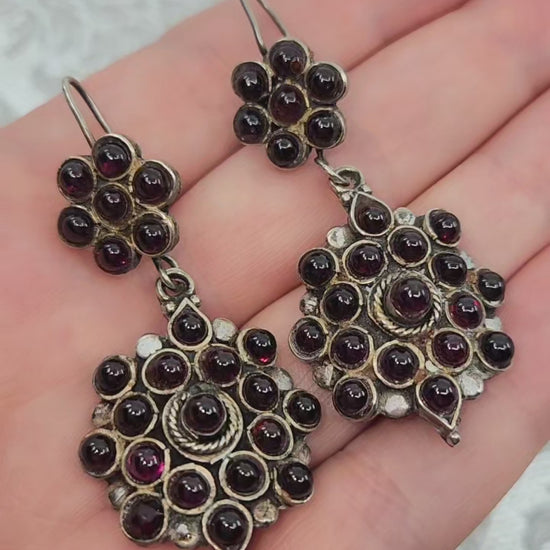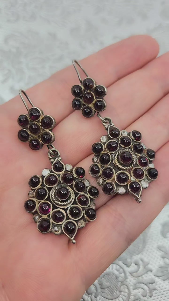 The earrings are in excellent vintage condition with only minor signs of wear. The silver surface shows typical light scratches and marks, but nothing noticeable or visible unless closely inspected. The backs are stamped 925, indicating sterling silver. The garnets are natural and free from chips.