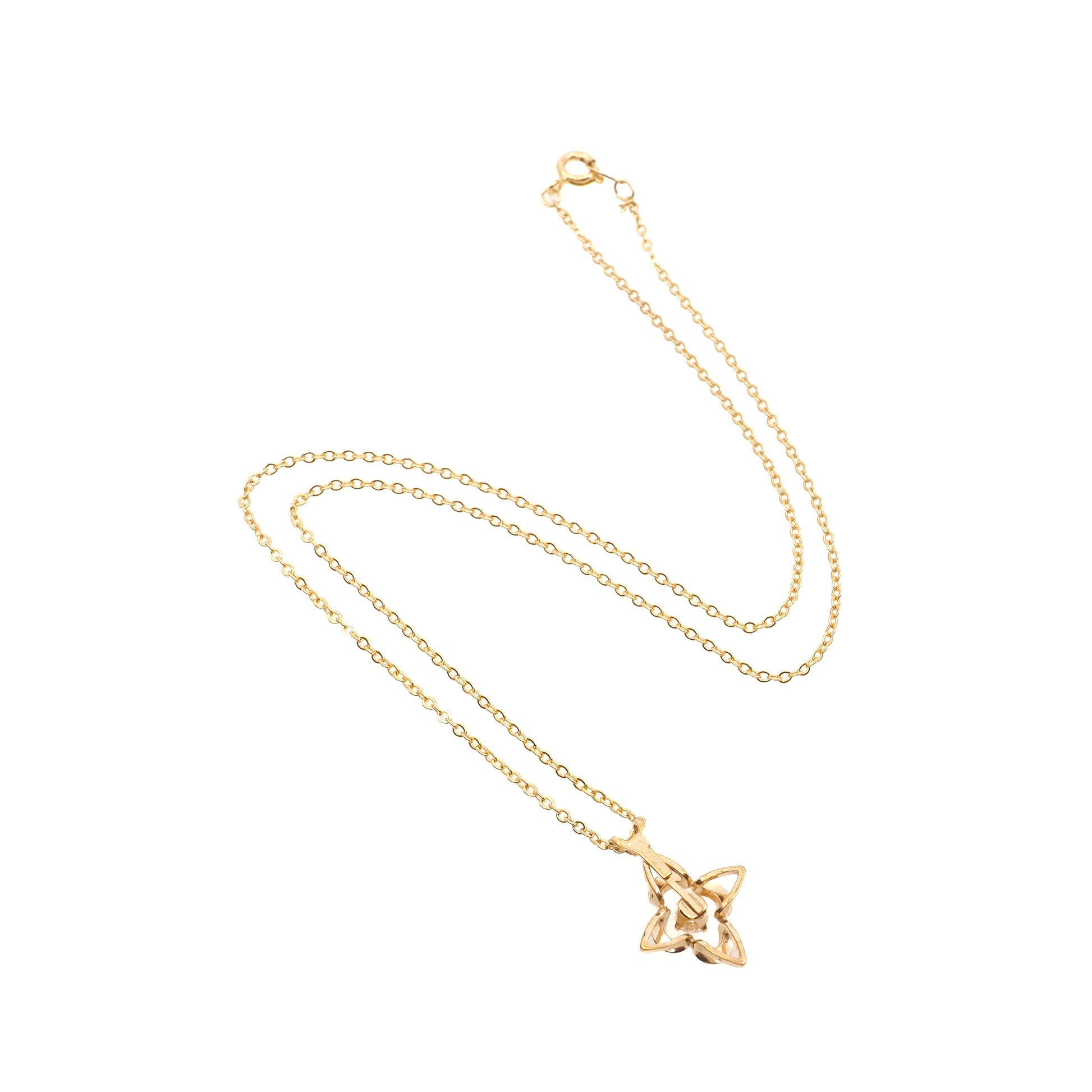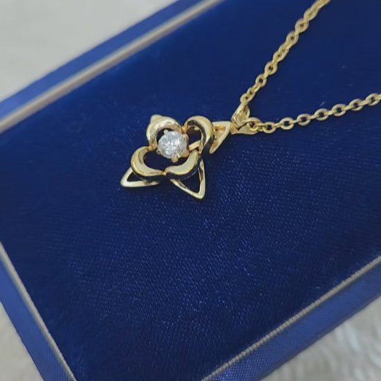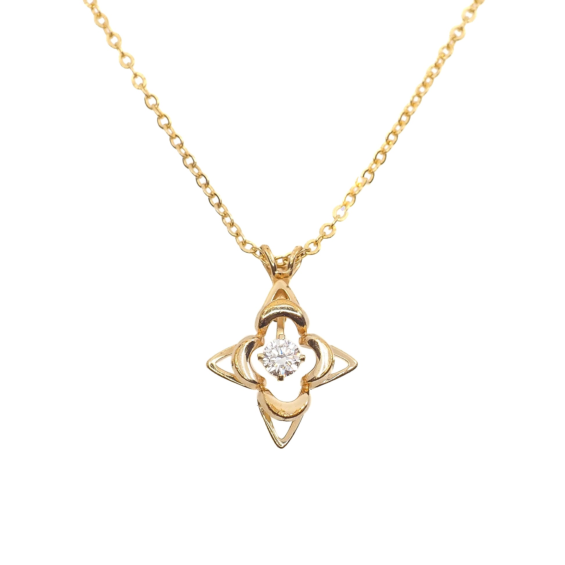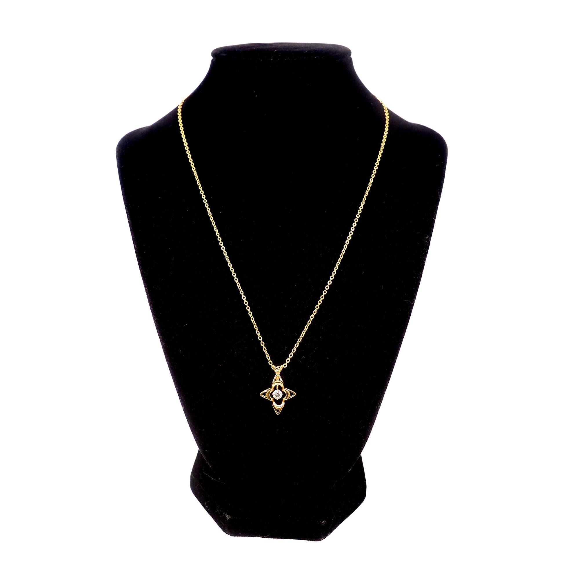 This classically designed and simple star necklace from the 1990s is set with a round-cut synthetic moissanite prong-set into yellow gold-filled metal. A great vintage star necklace by the Curtis Jewelry Manufacturing Company to add to your collection!