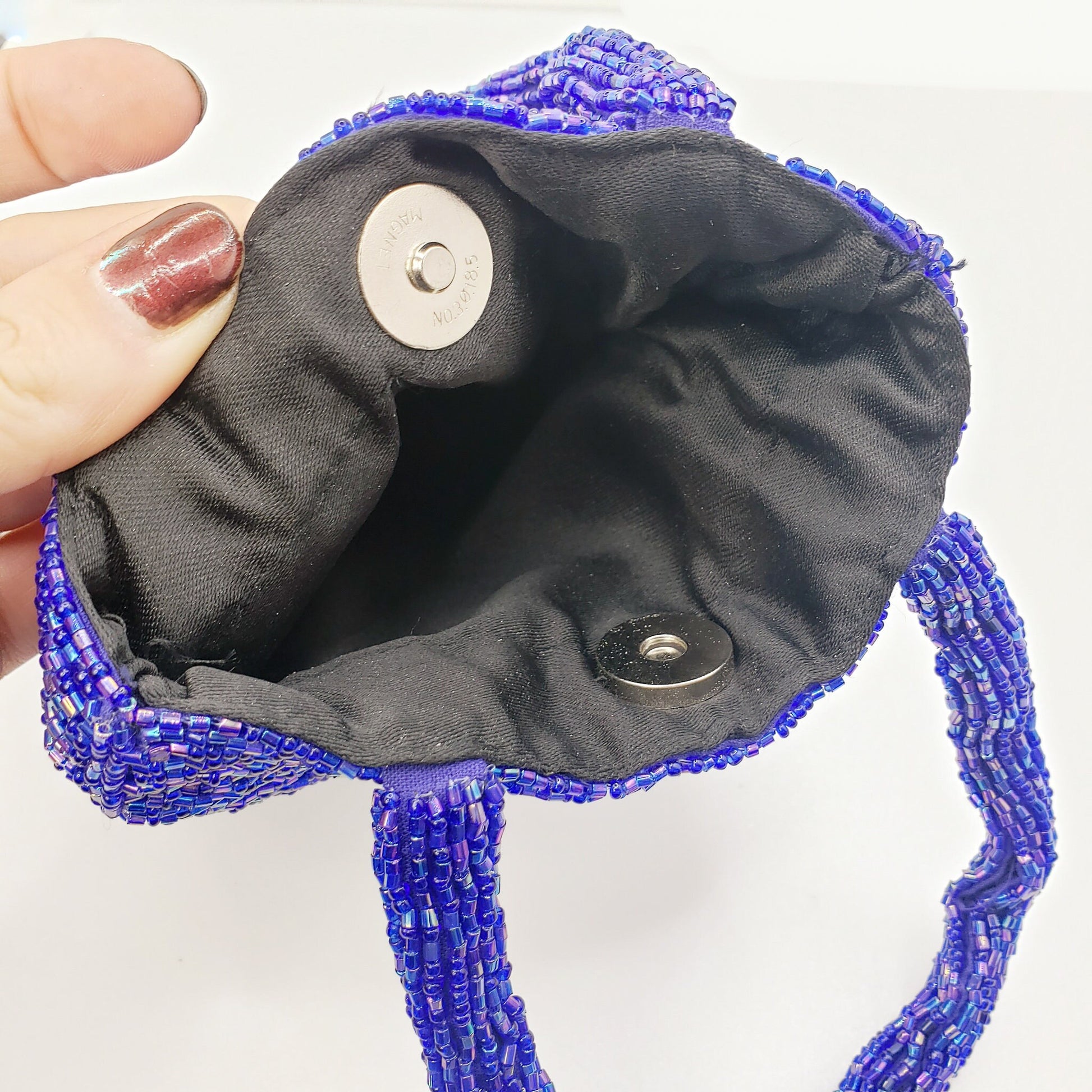 The purse is in very good to excellent vintage condition with slight signs of wear. There are no missing or darkened beads, and the lining is not ripped or torn. The magnetic button clasp is fully functional.