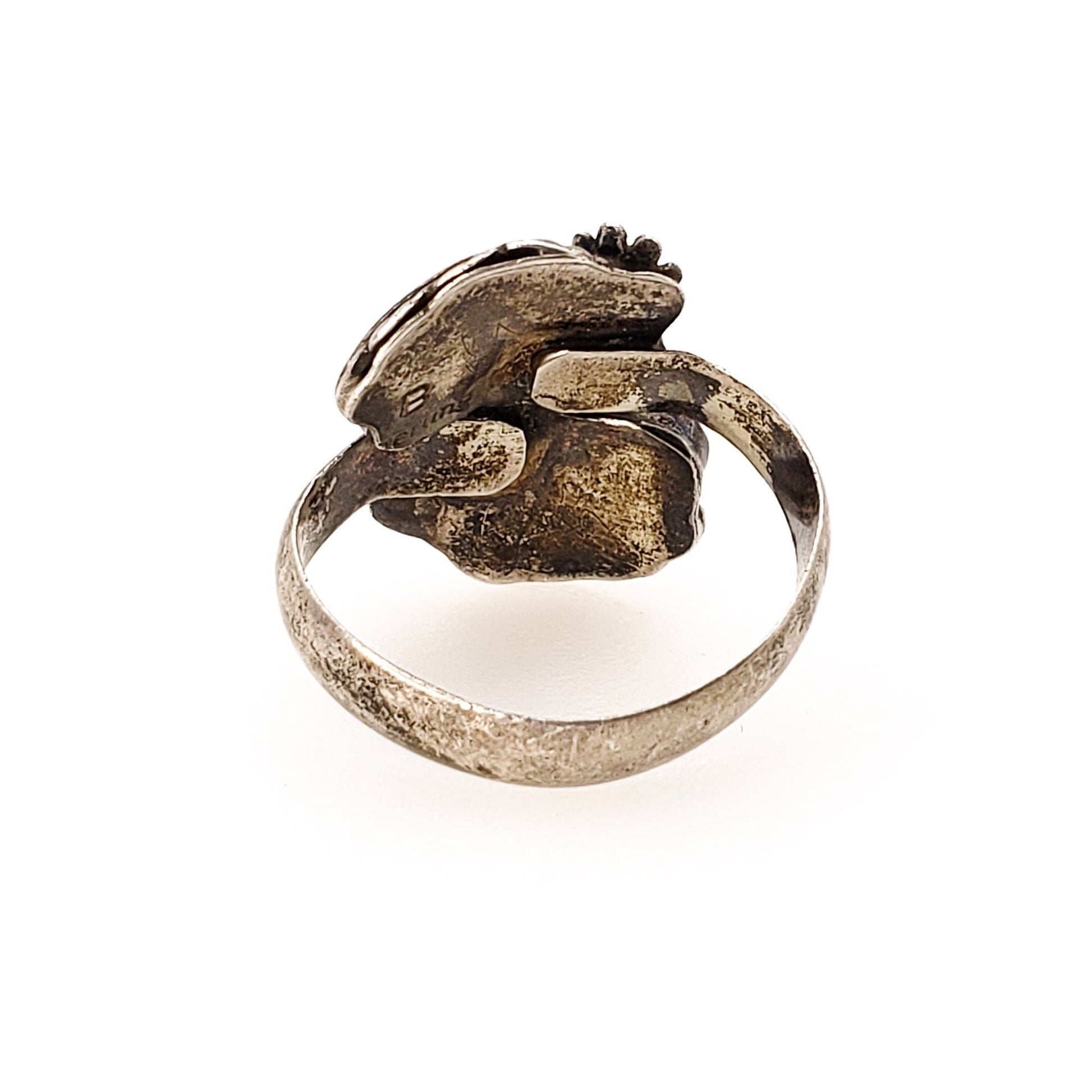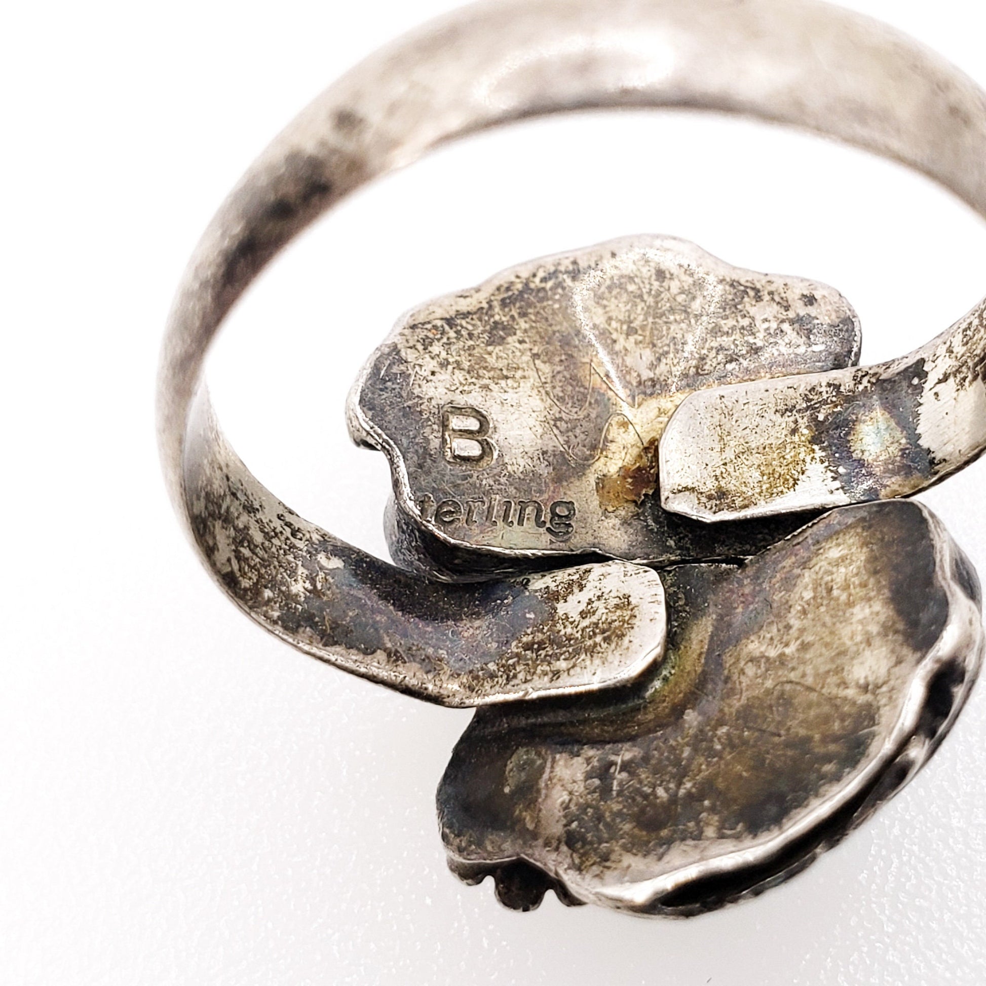 The ring is in very good vintage condition, with minimal signs of wear. The silver has a dark layer of patina that can be polished upon request. The adjustable shank is slightly out of round, which a jeweler can quickly fix. The stones are not chipped or cracked and are secure in the sawtooth bezel setting. The back is stamped B STERLING.