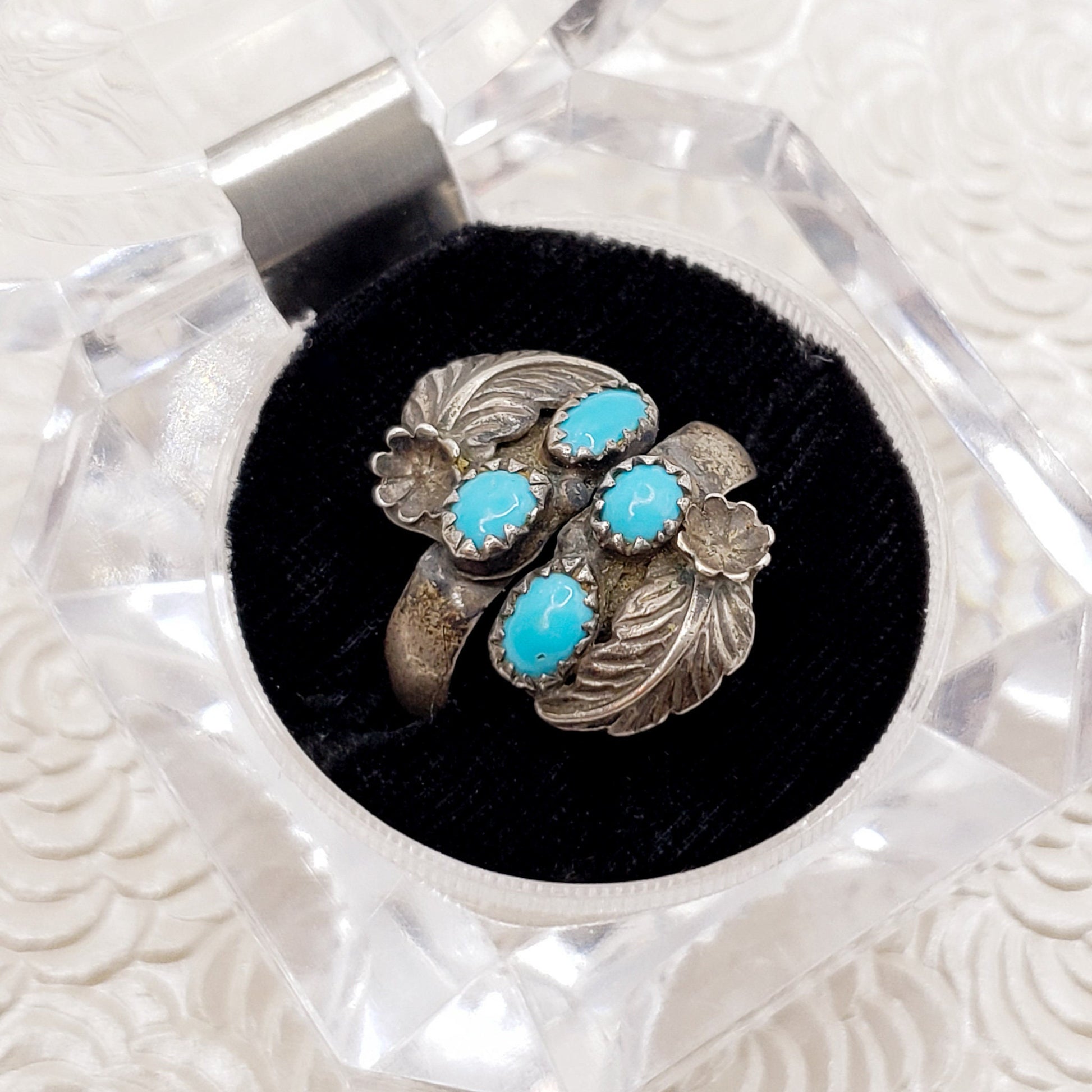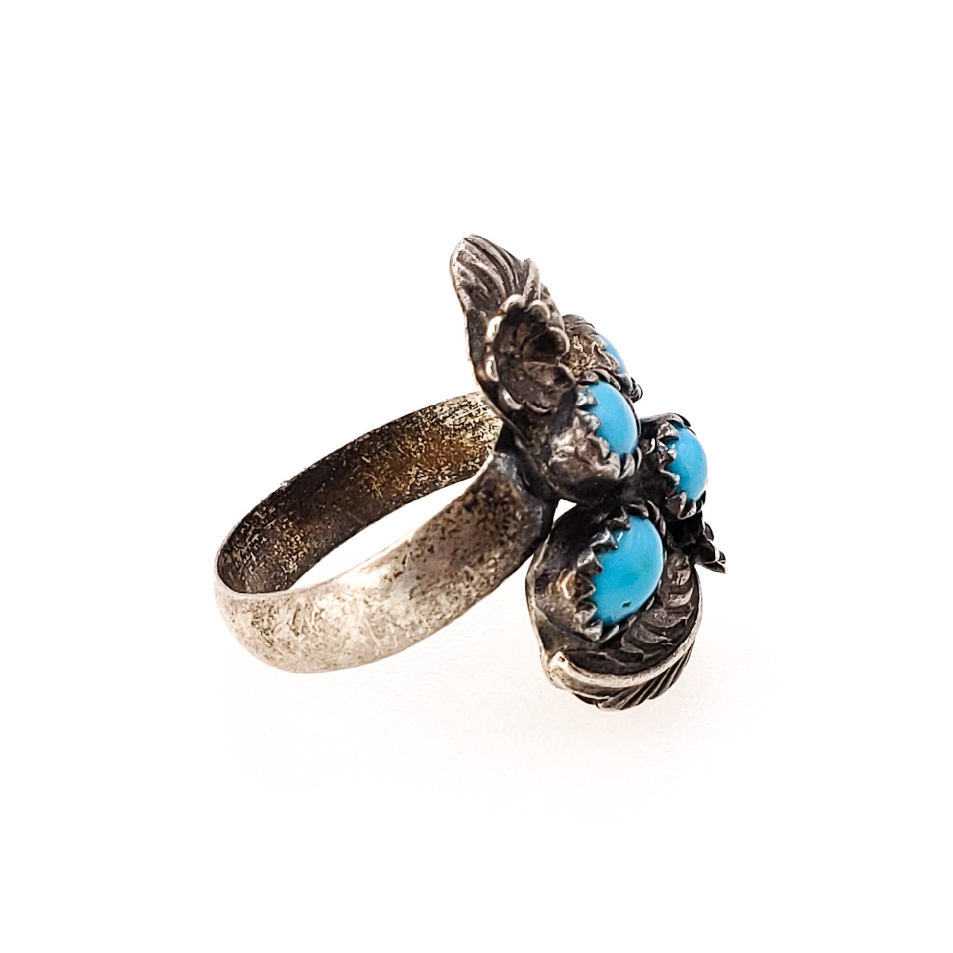 This classic Navajo ring from the 1960s features a southwestern design and is accented with four turquoise cabochons and feathers. It‘s a great ring for turquoise lovers, southwestern enthusiasts, or boho fashionistas!