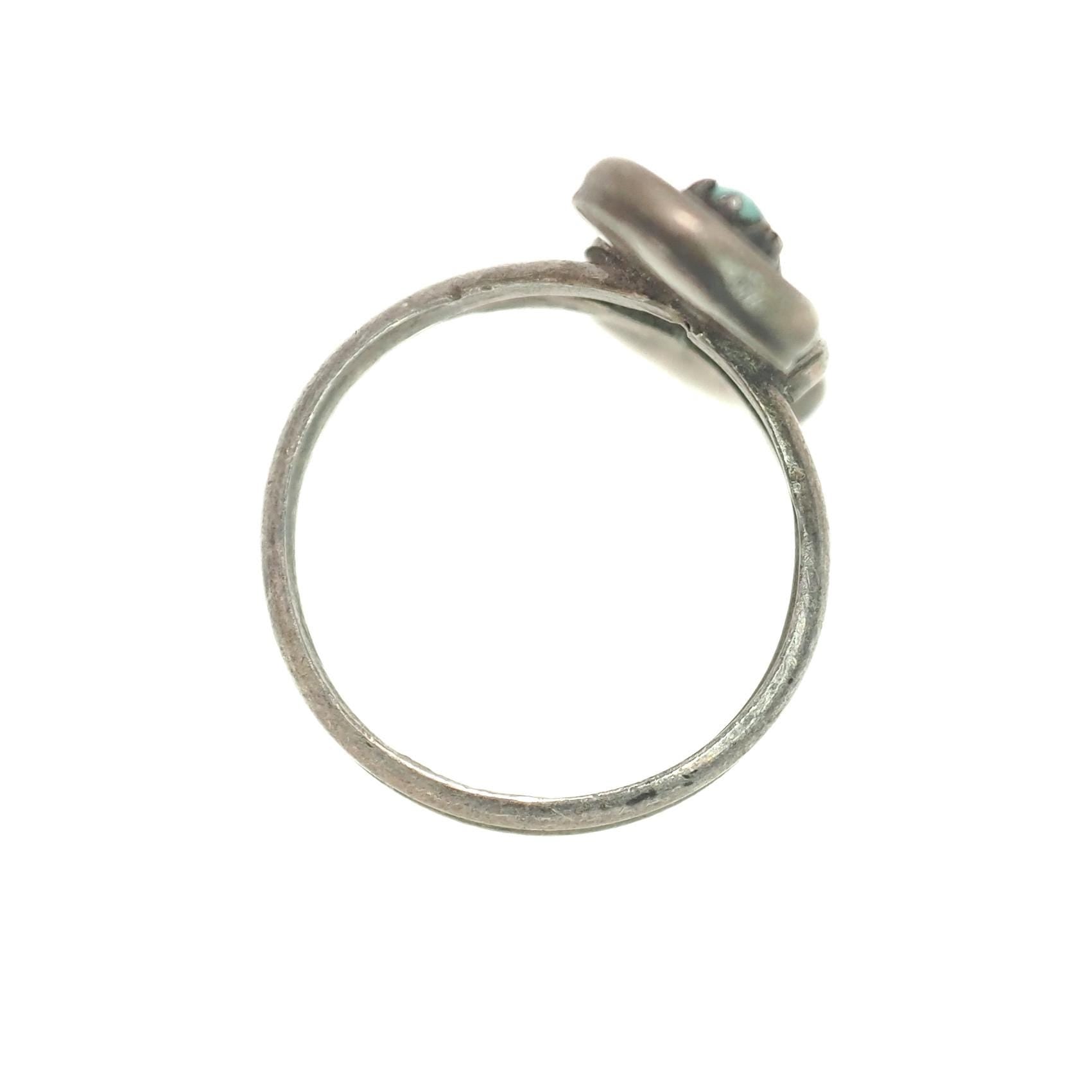 The ring is in very good vintage condition, with minimal signs of wear. The silver has a dark layer of patina that can be polished upon request. The adjustable shank is slightly out of round, which a jeweler can quickly fix. The turquoise is not chipped or cracked and is securely set in the sawtooth bezel. The back is stamped B STERLING.