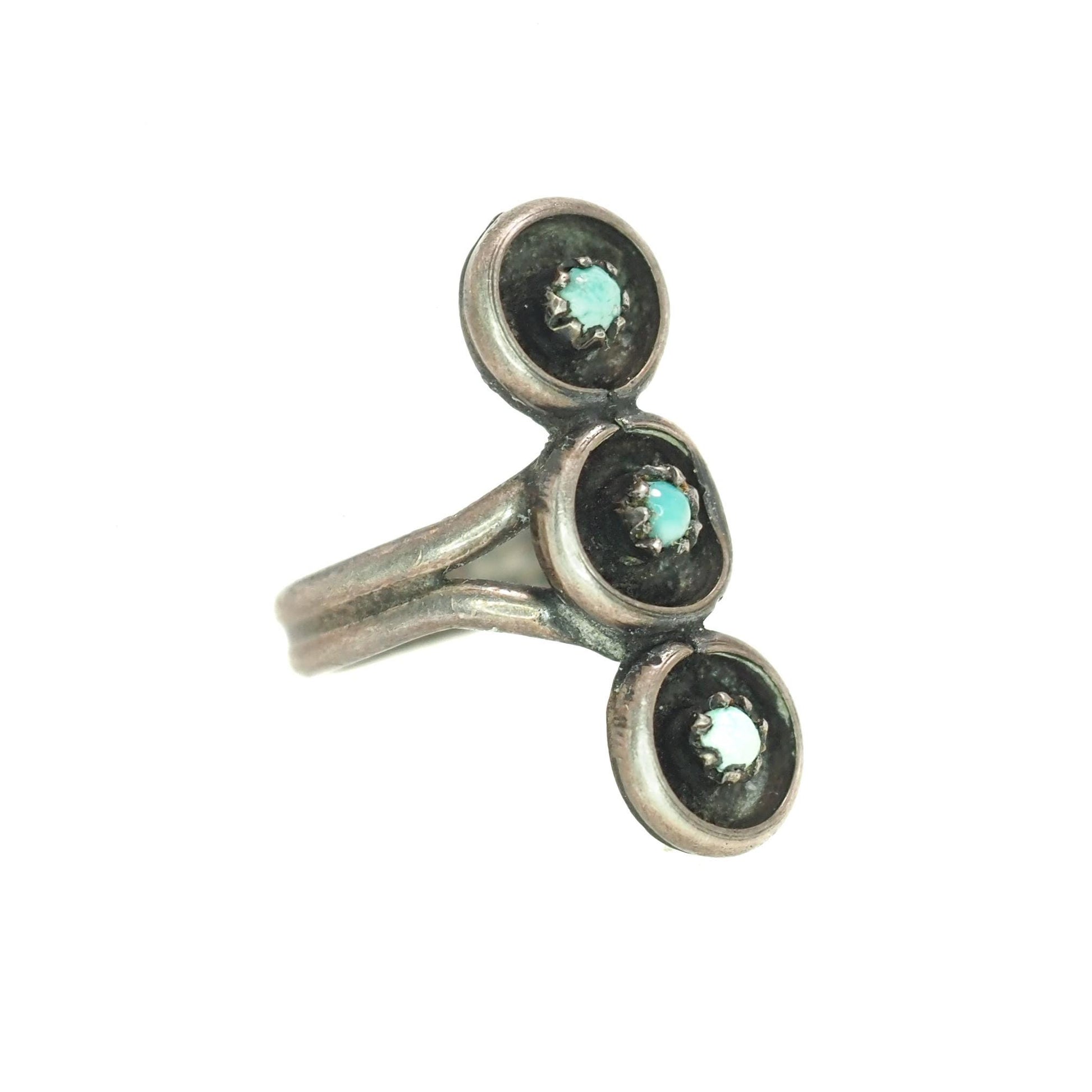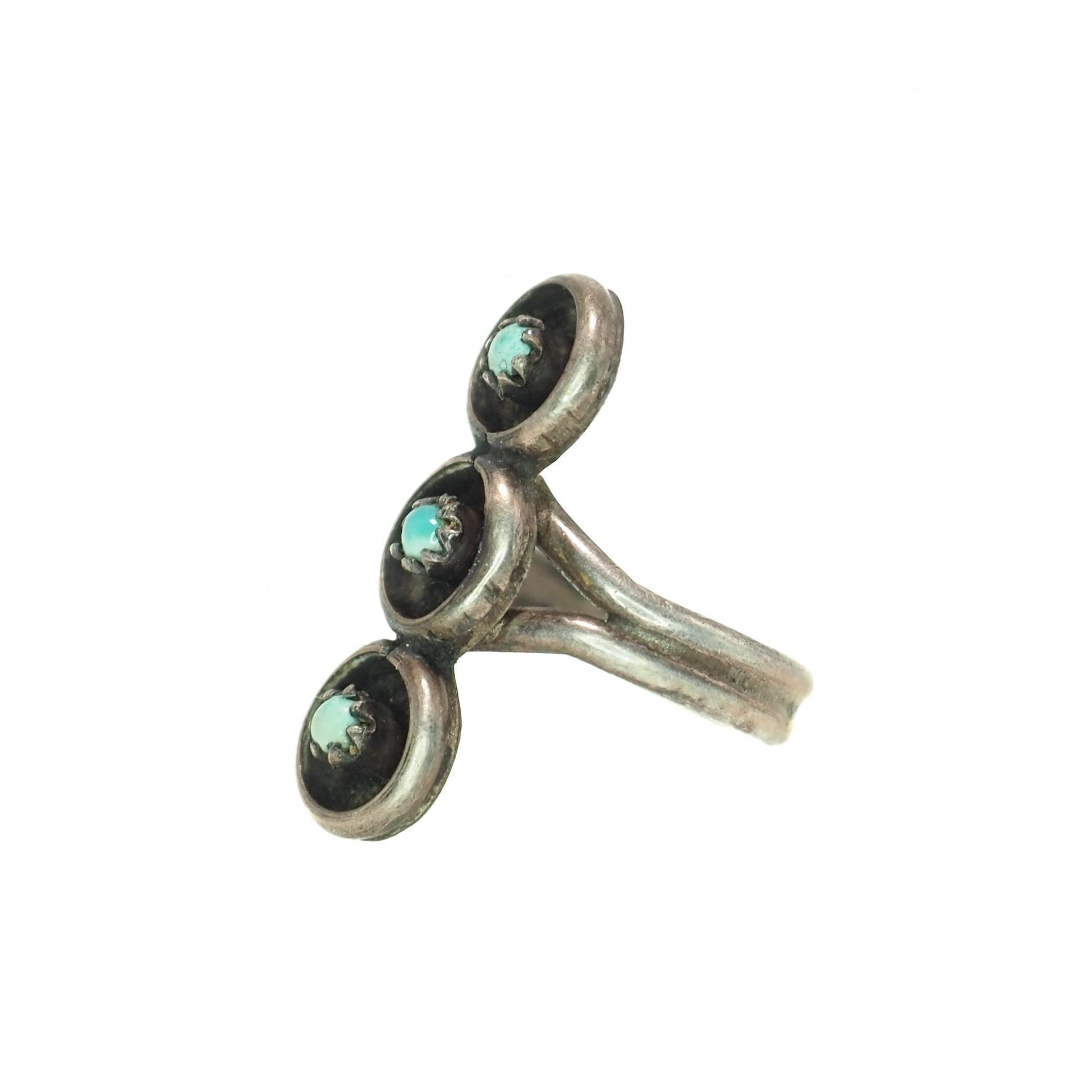 This classic Navajo 1960s ring features a southwestern design and is accented with three turquoise cabochons in a shadowbox motif. A great ring for turquoise lovers and southwestern enthusiasts!