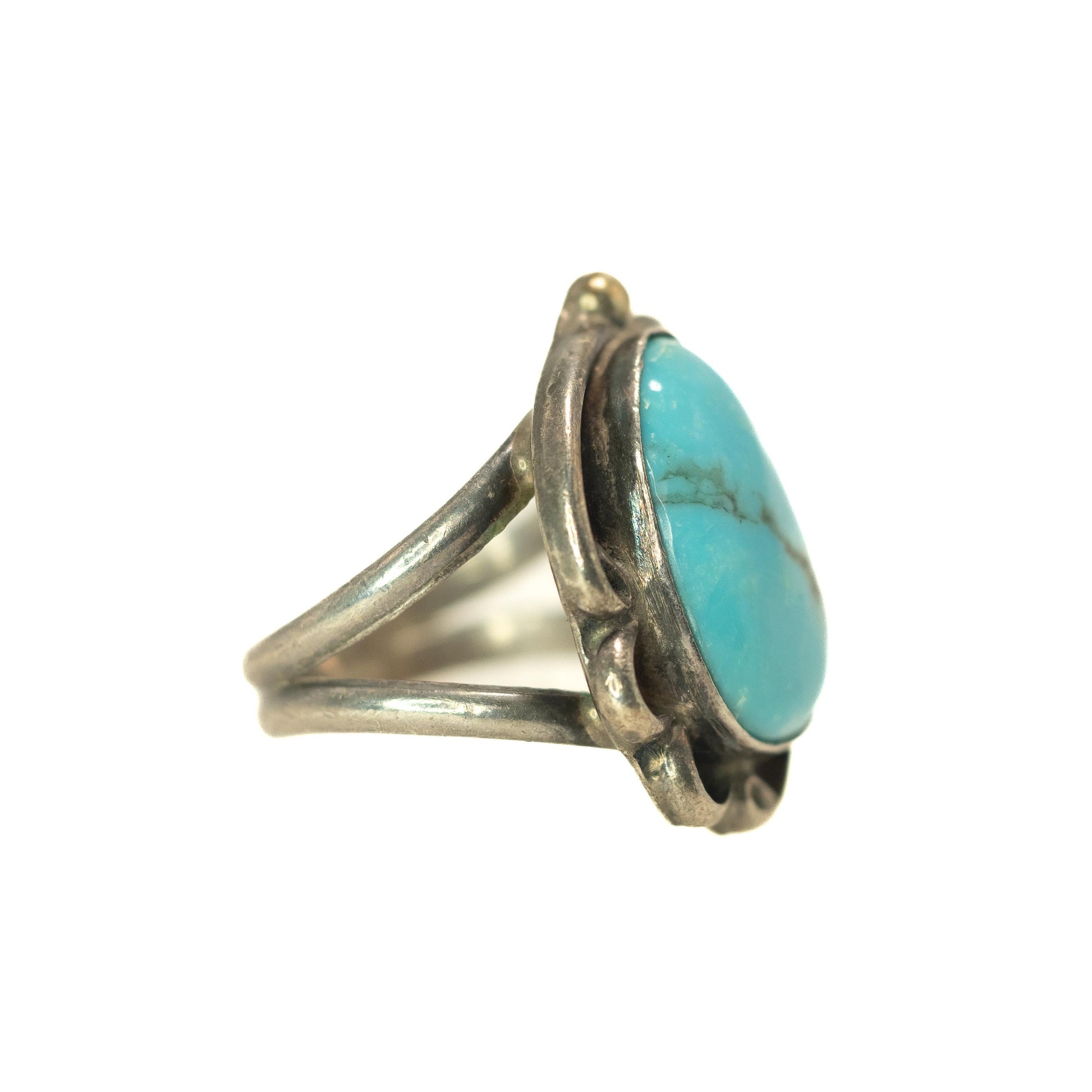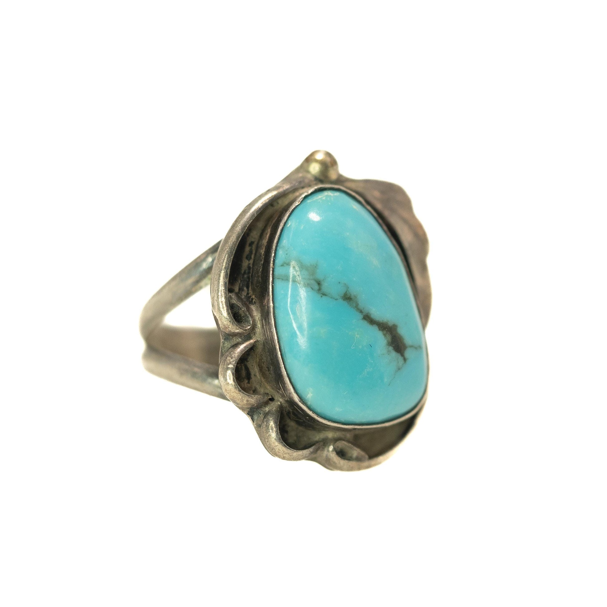 This bold vintage Navajo ring from the 1980s features vibrant blue turquoise set in sterling silver. The solitaire cabochon stands out beautifully against the aged silver. It‘s an excellent piece from the American Southwest to add to your collection!