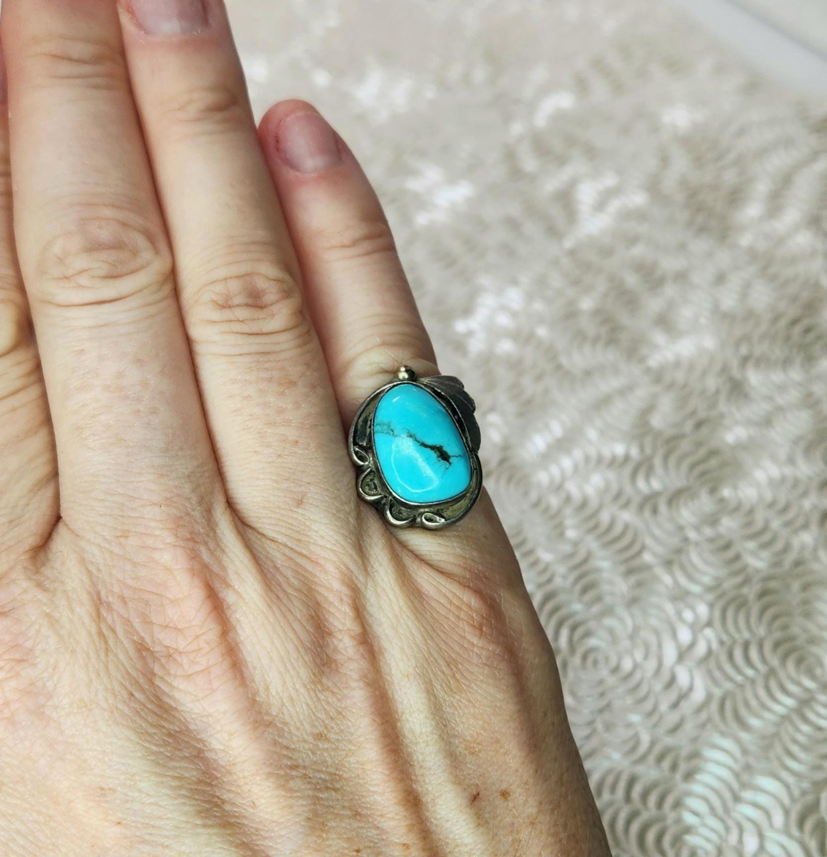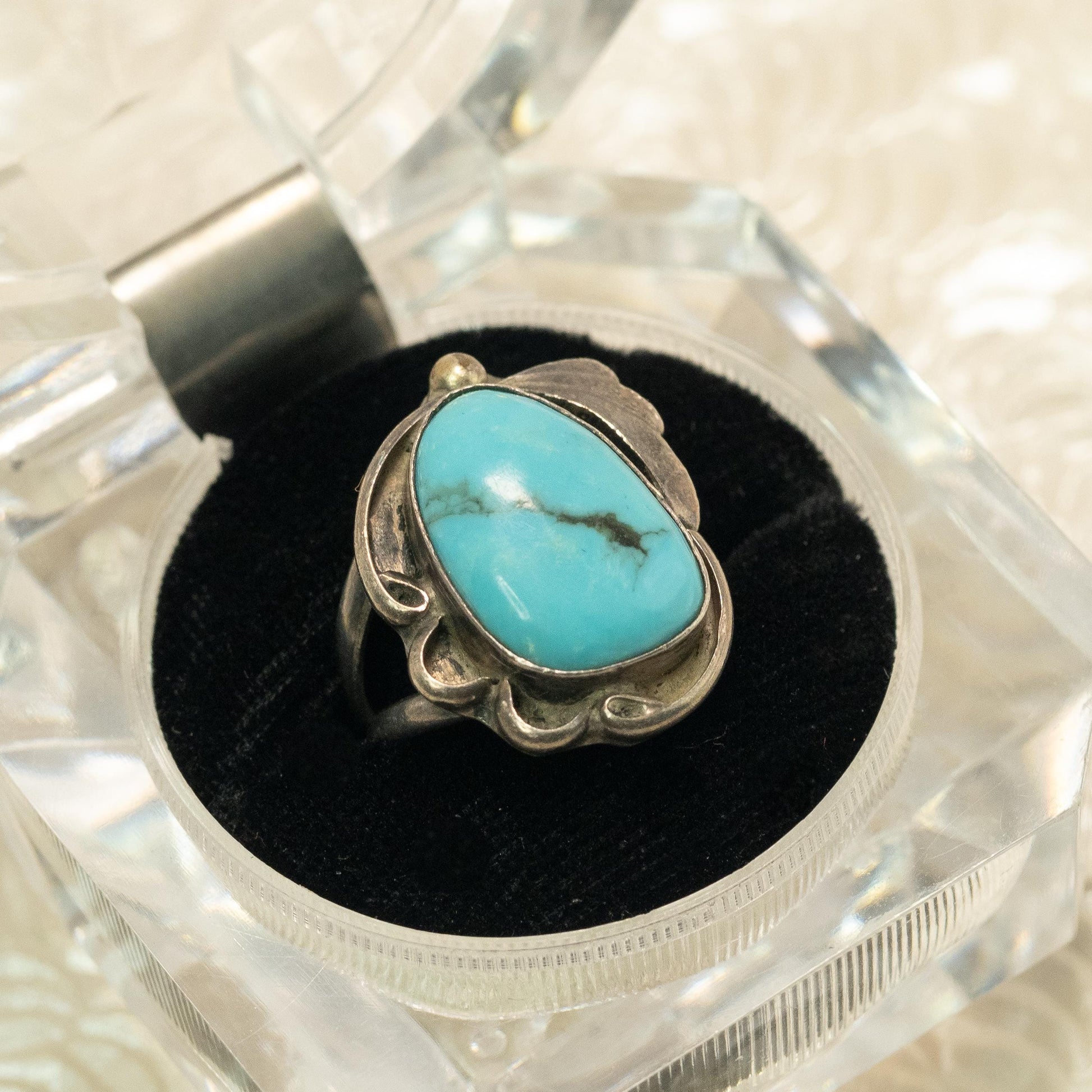 Vintage 1980s Blue Turquoise and Navajo Sterling Silver Solitaire Southwestern Ring Size 4.5